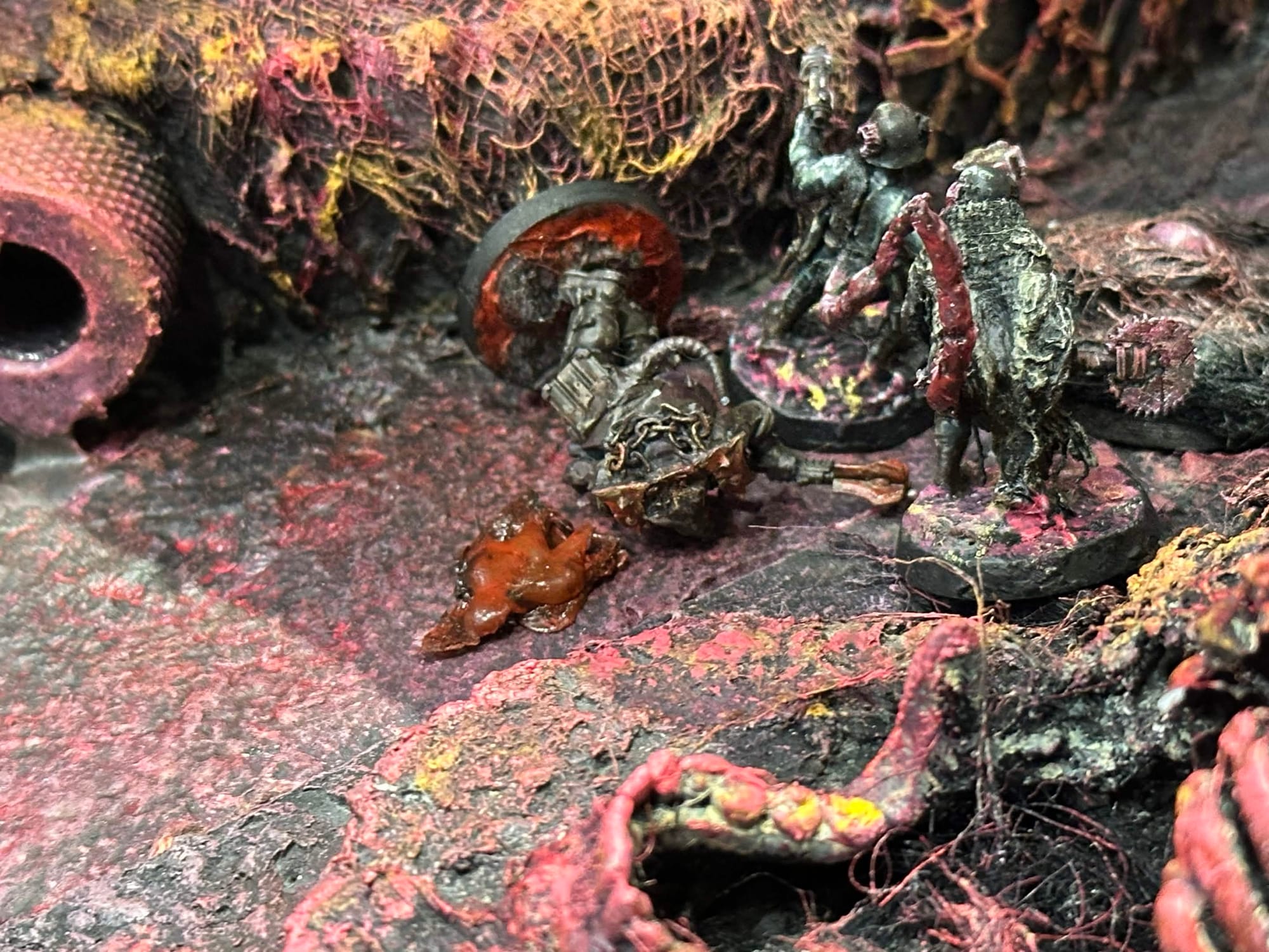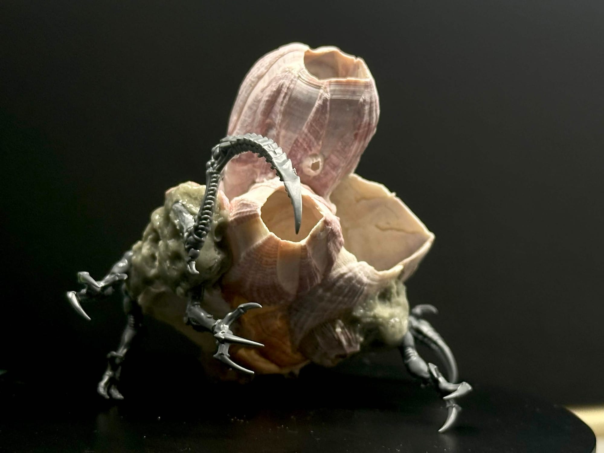 The barnacle creature makes me reflect on the experience of Adepticon as an arts event. People are paying to take art classes, sure, and nearly every competitive and casual event has the expectation that you paint (or pay someone to paint) your miniatures before someone will play with you. I made an effort this year to do very few events and instead walk through as many rooms as I could, and I was constantly seeing new boards, units, and armies. I bought a resin cast doubloon out of someone’s backpack. I bought miniatures out of a tackle box on the floor in a hallway. Everywhere I walked there was someone at a table reading or stealing some room to paint, and the Grim Dark Hallway had an active kitbashing table for something like three running days. Half of the money I spent at the con was on art supplies, and the most hype I got was seeing someone’s portable painting station with a light on it.