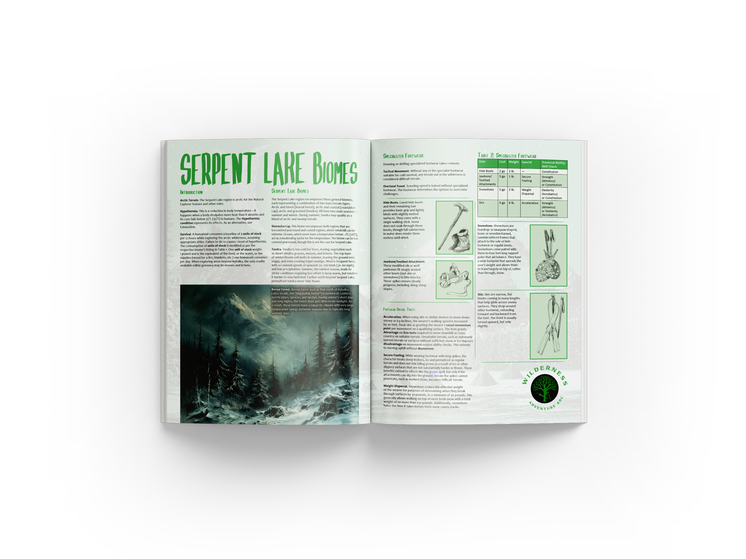 For example, Adventure Arc #1: The Red Tree of Grudges (Crowdfunding on BackerKit October 22nd) has specific sections within the magazine indicated by the color green and deemed "Wilderness". This particular entry (below) has arctic biomes describing a variety of unique terrain types one might encounter whilst adventuring in a dangerous winter wonderland.