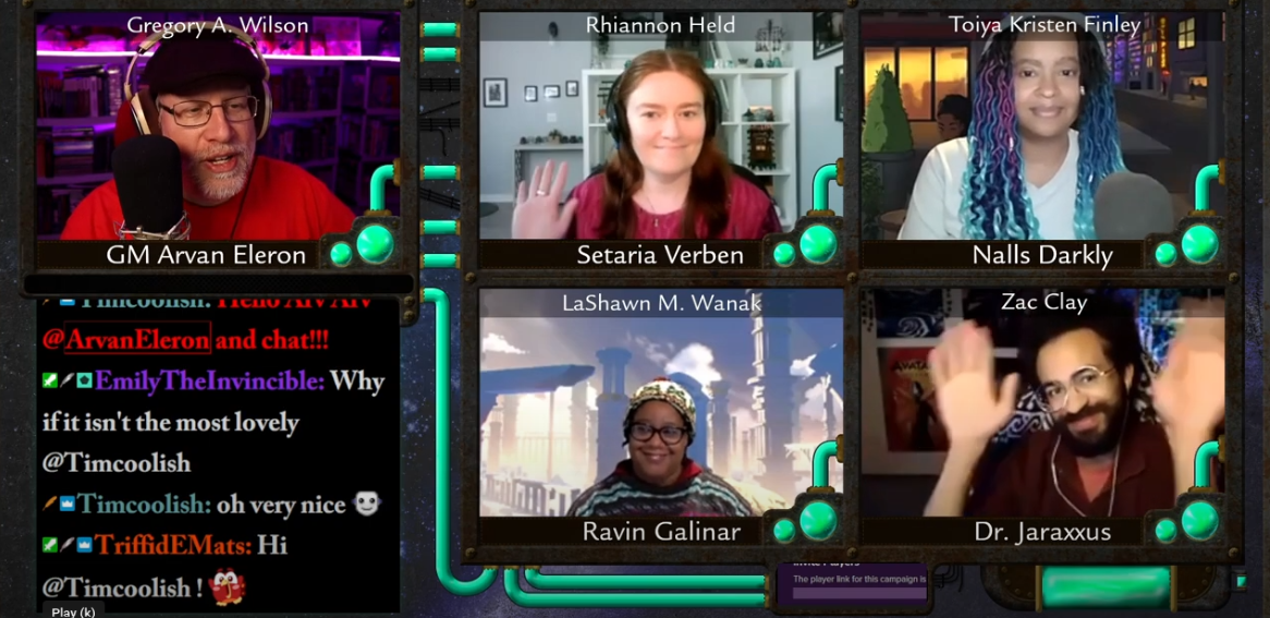 At 5 p.m. EDT Saturday, Arvan Eleron will GM Rhiannon Held, Toiya Kristen Finley, Zac Clay, and LaShawn M. Wanak in their continuing campaign of Expedition from the Mysterious Peaks, a TTRPG campaign that combines D&D fantasy with EsperGenesis psionic technology!