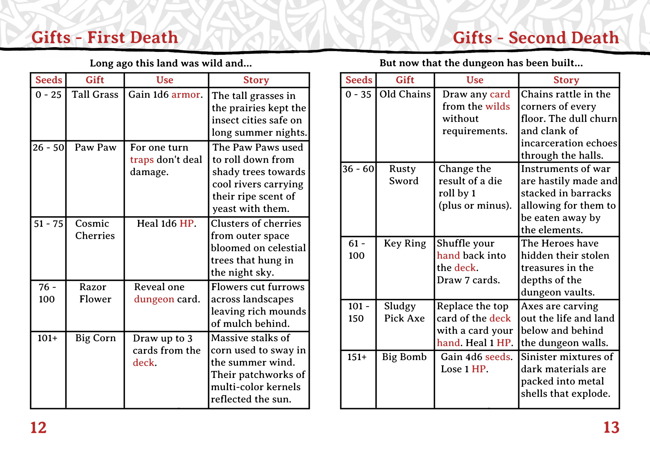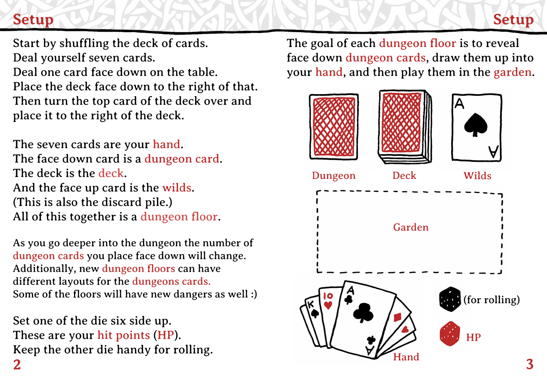 You’ll use trick-taking mechanics to remove dungeon cards that block your progress and collect seeds as you sow those dungeon cards into your garden. You have a small amount of hit points and a lot of ways to lose them so you’re going to die a lot. But every time you die the seeds you’ve collected fall to the dungeon floor and help the wilds grow. In return the wilds give you items you can use to survive longer on future runs.