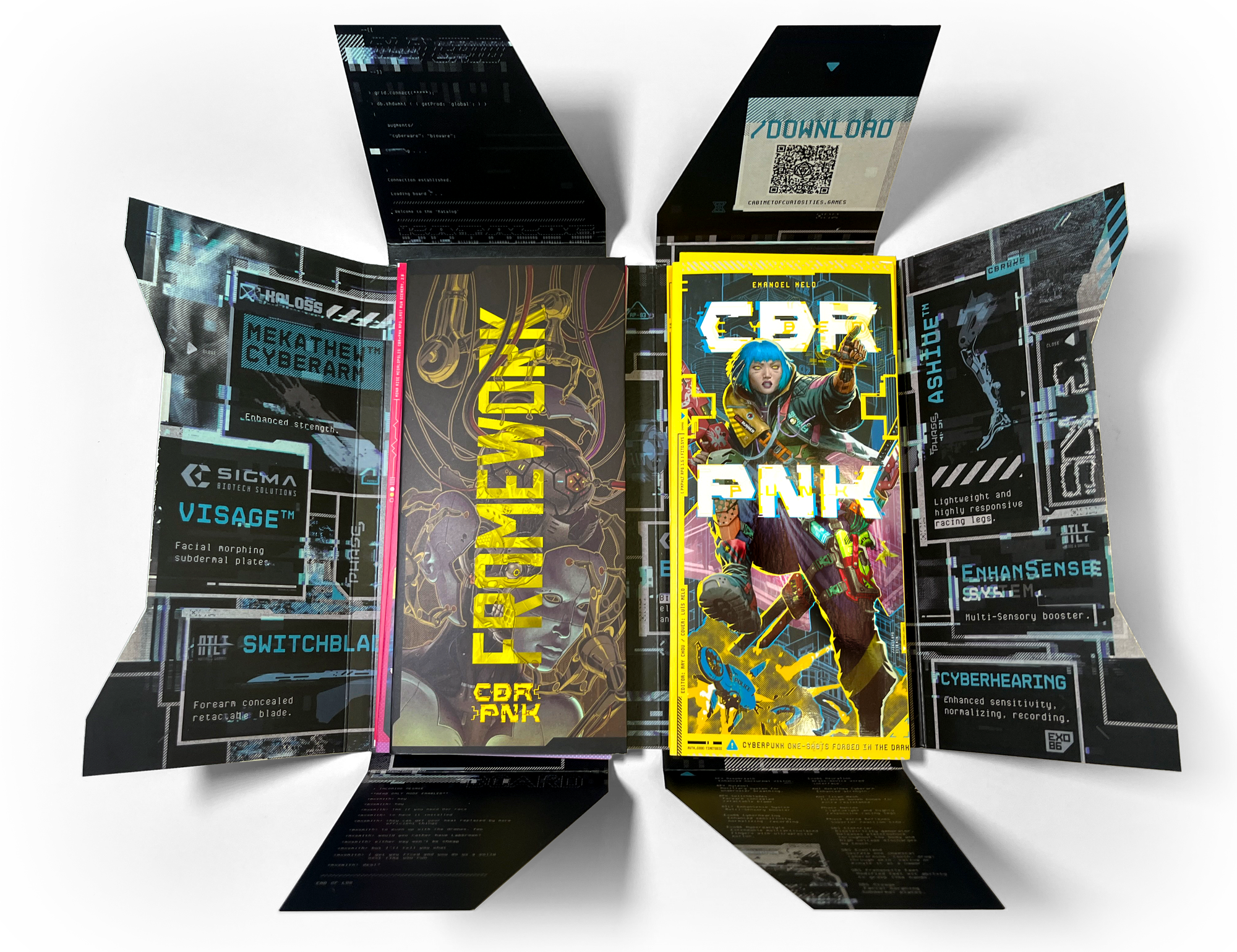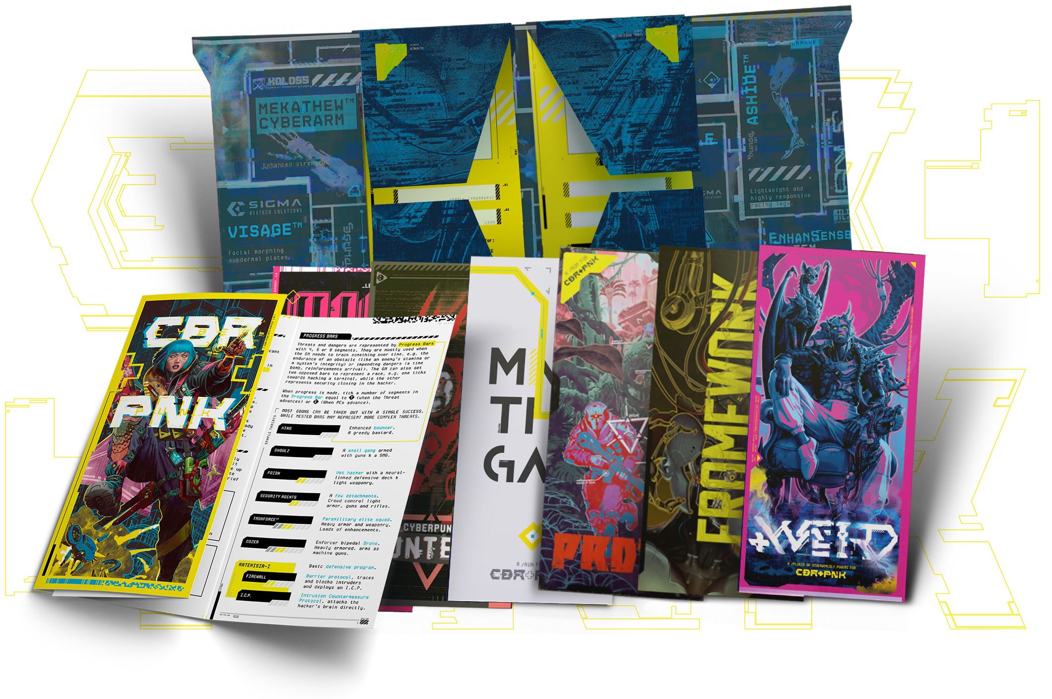CBR+PNK: OVERLOAD includes one-shot scenarios, gear catalogs, /Plugin rulesets, and complete settings—grouped into three sleek thematic packs with high-end packaging and content on the inside covers.