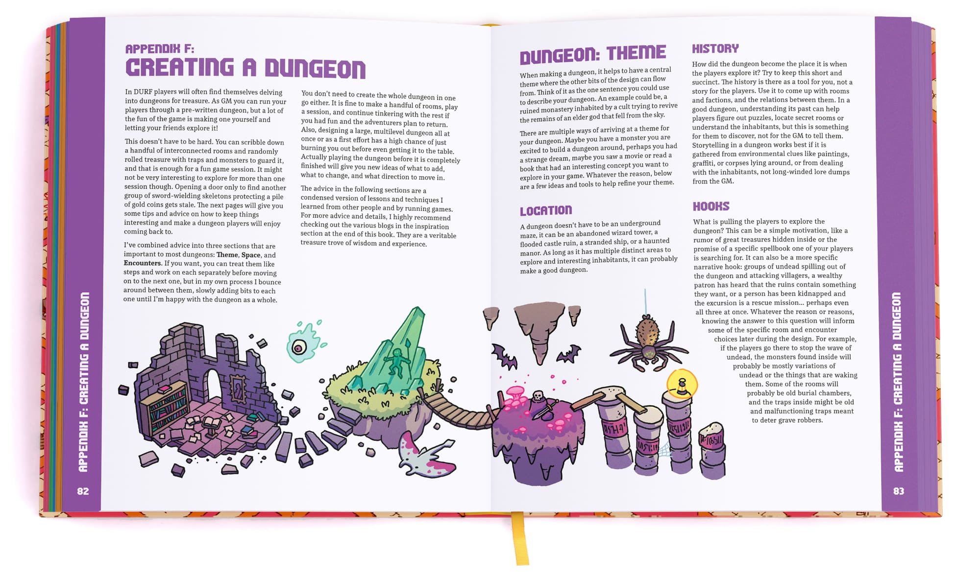 This new version of DURF is Emiel's love letter to that community and expands on the things found in the original little booklet. This 200-page hardcover book is the definitive version of DURF and like the original it is fully illustrated by Emiel. Its simple dungeon-fantasy core has been updated with more streamlined procedures for dungeoncrawling, overland travel, and magic, and has been expanded by a whole slew of appendices covering anything a GM might need!