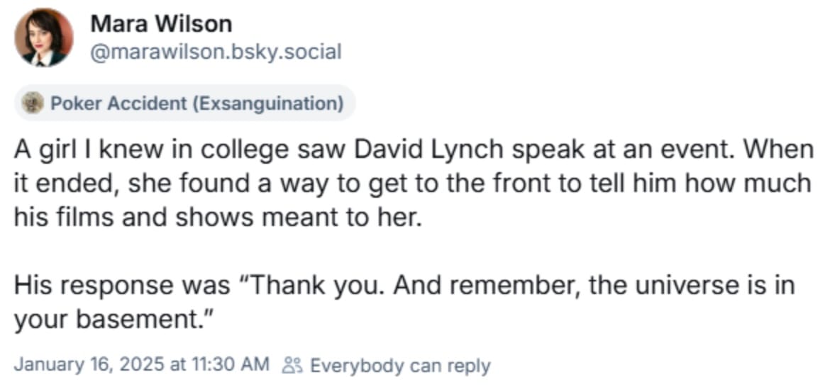 The jam started on David's birthday, January 20th, and runs until Twin Peaks day (February 24th at Midnight). The David Lynch game jam has game designers of all sorts (both TTRPG, video games, and visual novels), authors and writers (like my friend Briar Ripley Page), and maybe even include poetry and art. This jam is open to beautiful and radical acts of creation, just make it with your wild, tender, loving, and weird heart.