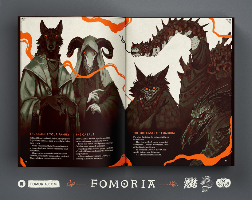 Fomoria’s folk horror has a distinctly paganistic aesthetic: a towering goat priest, a scowling pangolin warrior, and a grinning bat figure with vacant, bloodshot eyes count among your morbid crew. These travellers navigate a grim purgatory that festers with Darkness (that’s with a capital D), an encroaching sickness that eventually devours all light and life. Then there’s the tabletop RPG’s quickstart guide, which is also resplendent with illustrations of these bestial beings. Wielding gnarly staffs and oversized swords, they are seen fending off howling eldritich terrors while descending — or falling — endlessly into voids. In other words, its horrors are extremely primal, and extremely my jam.
