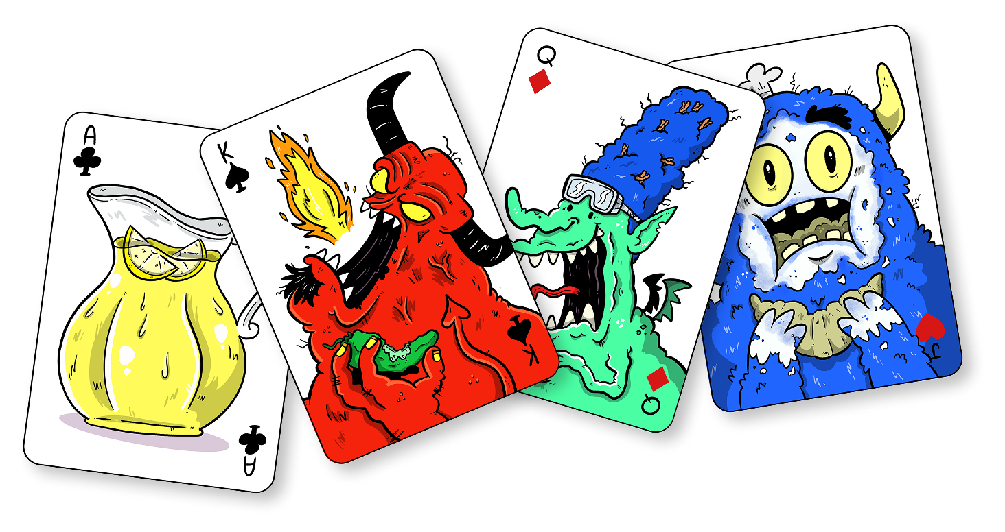 The more we playtested Food & Evil, the more we realized one more thing: This game generates a lot of puns. Like, A LOT. To encourage the silly, joking behavior and to have some control over random card outcomes, we made it a rule to give players a bonus point on their next flip if they said a pun or did something creative in the scene.
