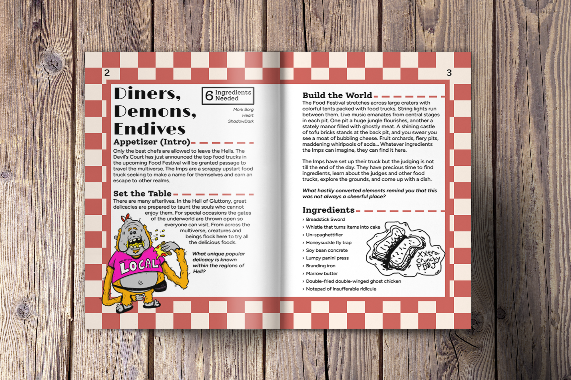 Much like Big Top Burger is seen in many locations, I wanted your food truck in Food and Evil to travel. By creating such a light and breezy system, Food and Evil can easily be played in any setting, including your current D&D campaign. You can use your own characters instead of demons as your adventurers and go on whimsical journeys. While Food and Evil will include more than 10 adventures, I don’t want the book to be sitting on your shelf waiting for you to finish your 2-year campaign before playing it. This game is malleable and fits in any space it needs, much like Steve and their amorphous body.