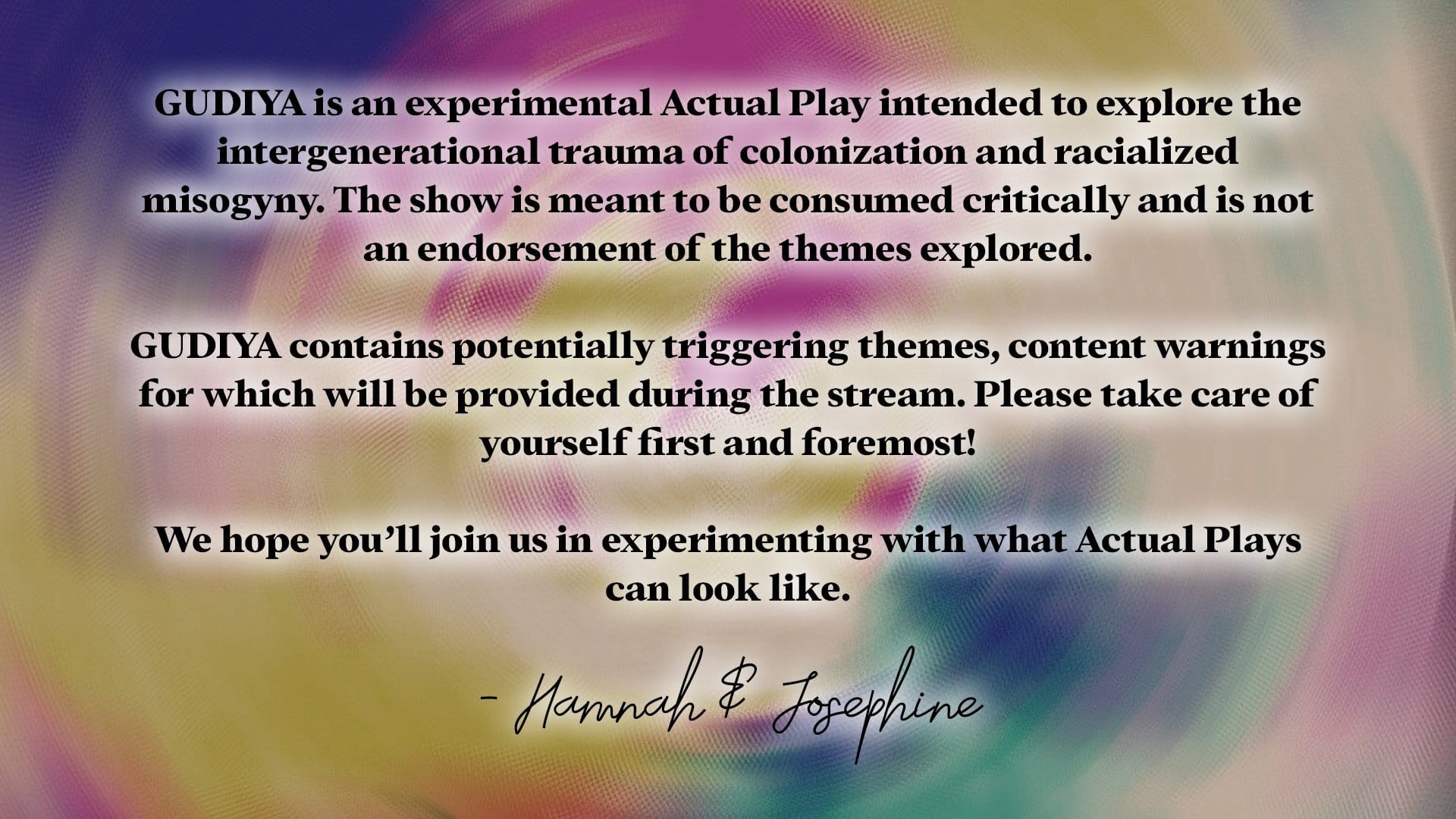 In Rascal’s first foray into indie actual play criticism, I feel compelled to start with Nameless Domain’s GUDIYA. The Best of the Best at the 2023 New Jersey Webfest, GUDIYA is a work I’ve referenced in nearly every conversation I’ve had about the future of AP. While I have spoken at length to the cast and crew of GUDIYA about their intentions behind the two-hour long psychedelic horror (one shot… feature…special? The language of this medium is still developing and solidifying), I still find new elements to examine and dissect upon each subsequent rewatch.