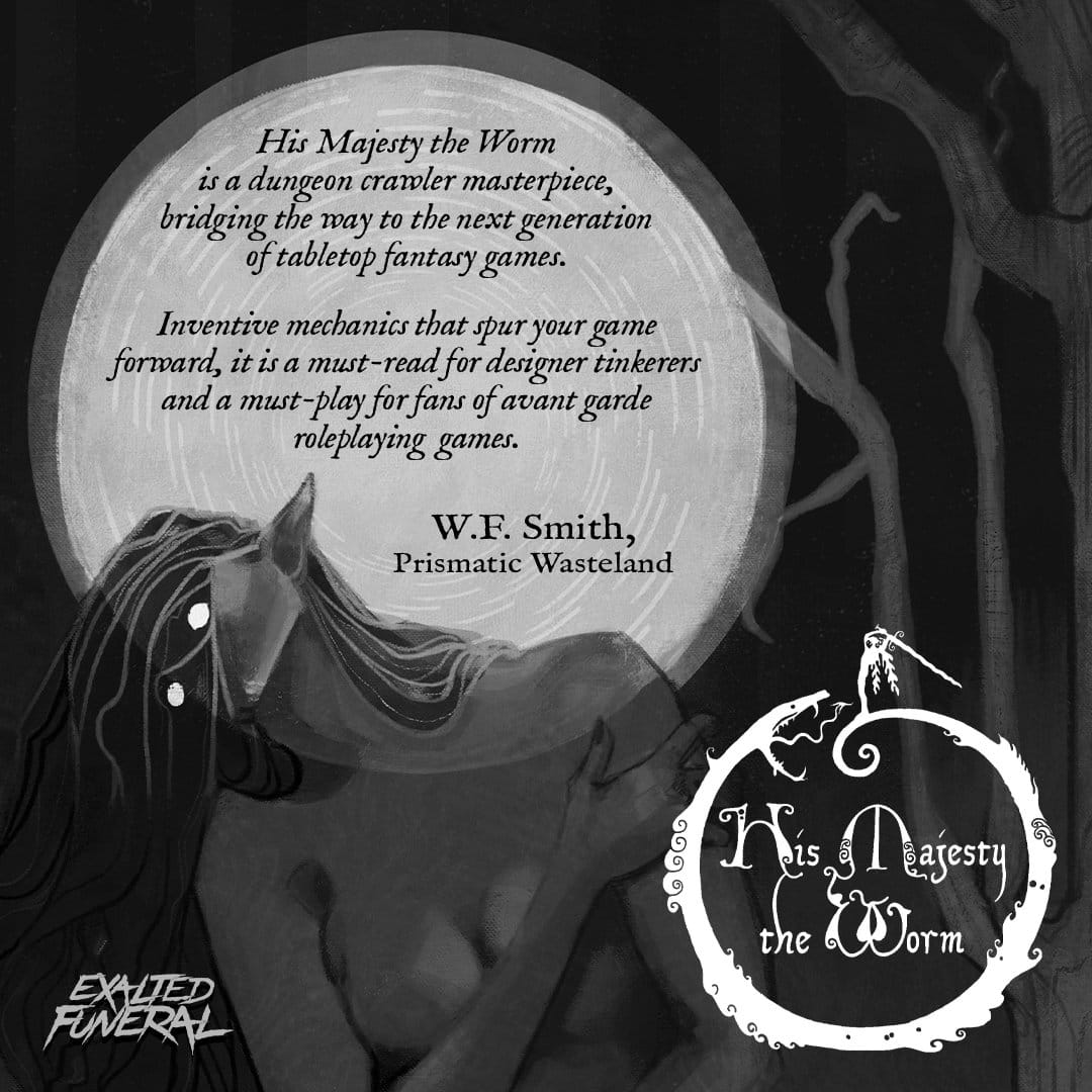 His Majesty the Worm is a tabletop roleplaying game designed for dungeon crawling written by Josh McCrowell and published by Exalted Funeral. The Game Master is given tools to create a megadungeon called the Underworld. The players create adventurers to explore the Underworld in pursuit of their personal quests. Tarot cards are used as a randomizing element.