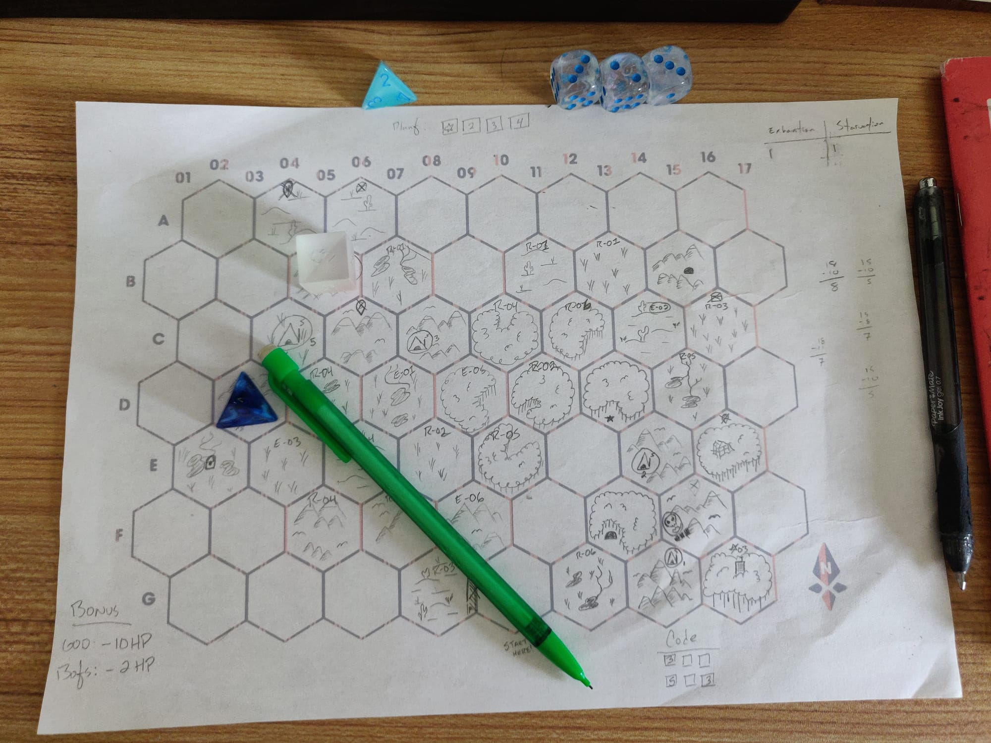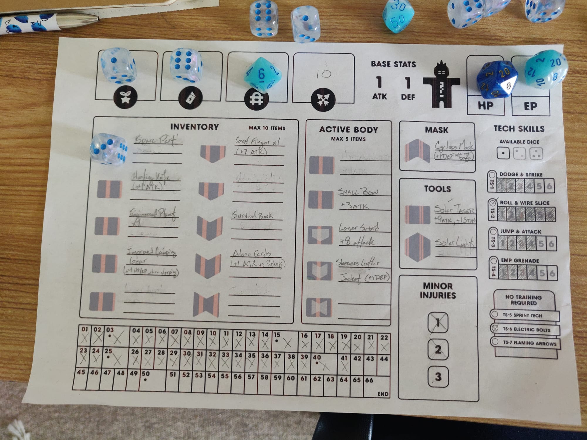 All of this, including drip-fed narrative bits and the placement of dice on my character sheet, should have slipped between the mesh sieve of my memory during the first hiatus – a three-week break as I moved across the Atlantic. And yet, when I pulled the red zine from a cardboard box and cracked it open, it was surprisingly easy to fall right back into the loop. The book is simply laid out well. Its first pages explain recommended materials and necessary terms before spending four full pages on a step-by-step process of moving through each in-game day. Chunky bars in stark red and black separate digestible paragraphs. There is a third color, gray, to denote optional rules for weather and first aid, at least in the 2025 edition.