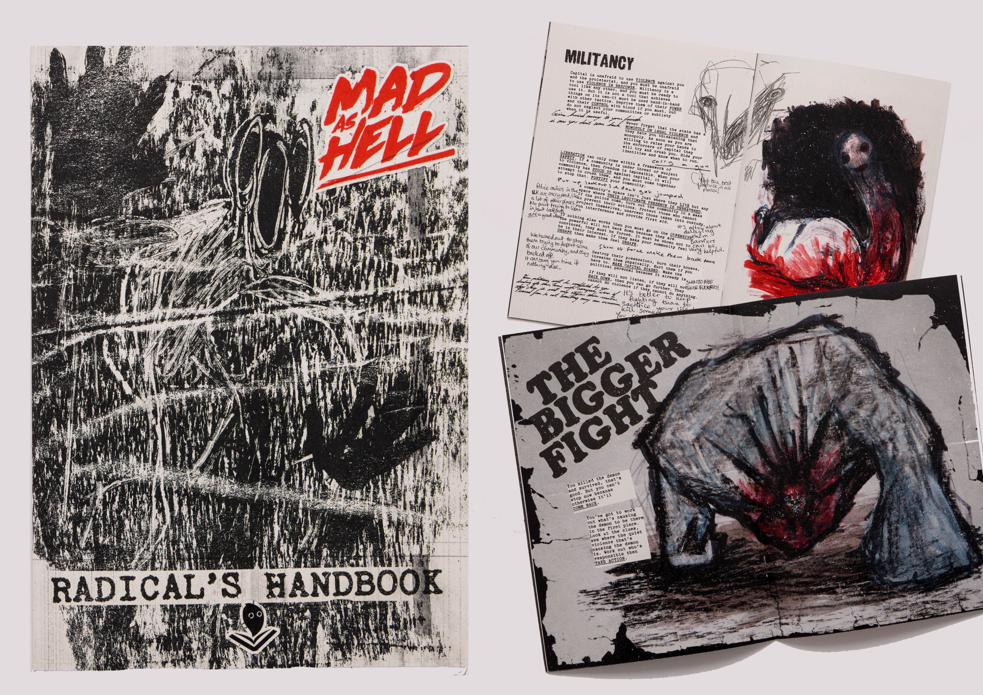 As part of the core rulebook, we’ve created the Radical’s Handbook. This homemade zine is an in-world guide to demon hunting that acts as both a player and character primer. It contains commentary from multiple in-world Radicals, woven into the stunning art from Scrap Princess. The Handbook will be rendered in a different paper stock inside the hardcover itself, separating the Player and Game Master sections.