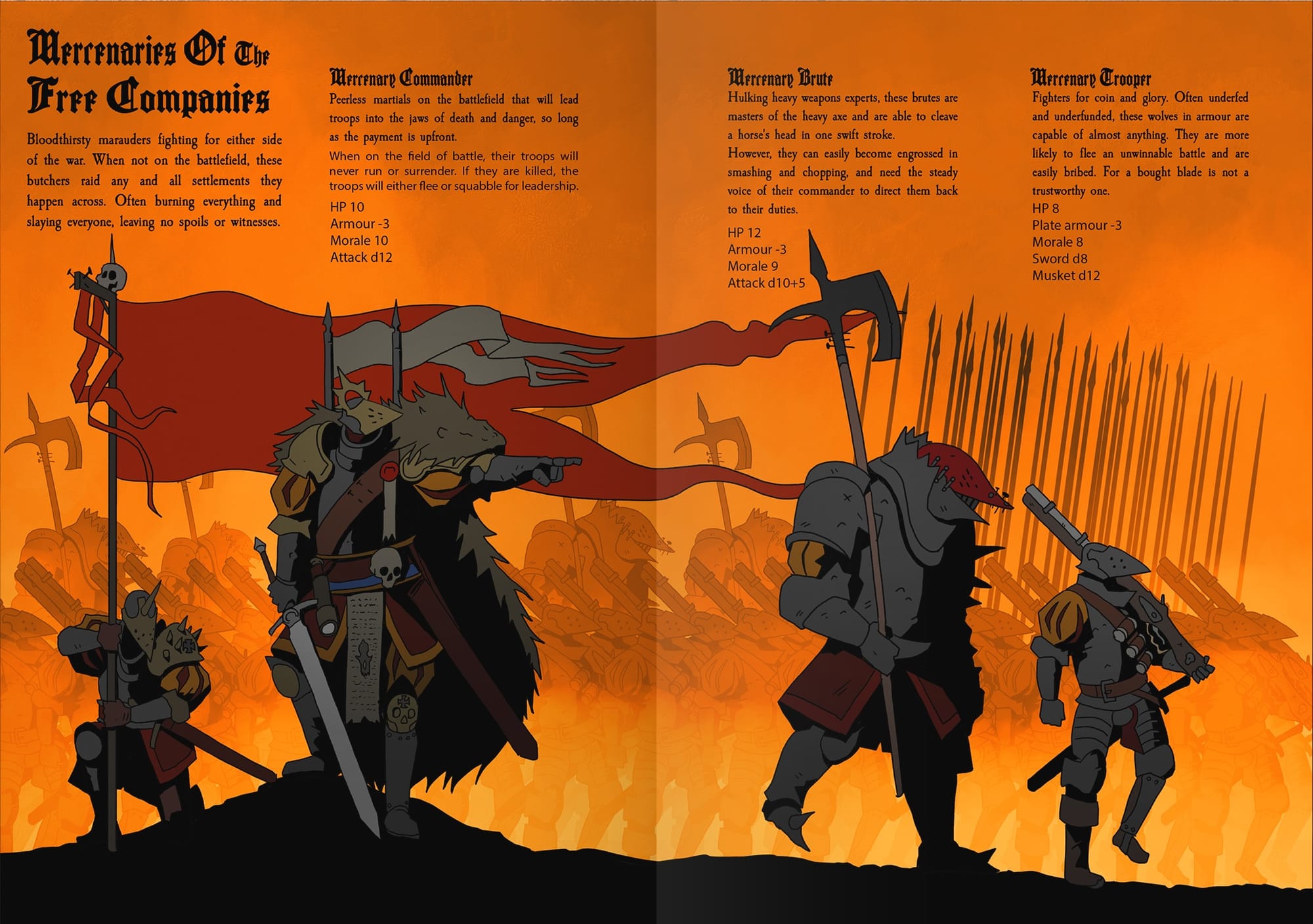 Wield unique and characterful weapons, each with their own rules and advantages on top of the damage die. The arsenal includes the dreaded Black Powder weapons - infernal devices that ignore all armor on a hit and can cause as much mayhem and destruction to the wielder as the intended target.