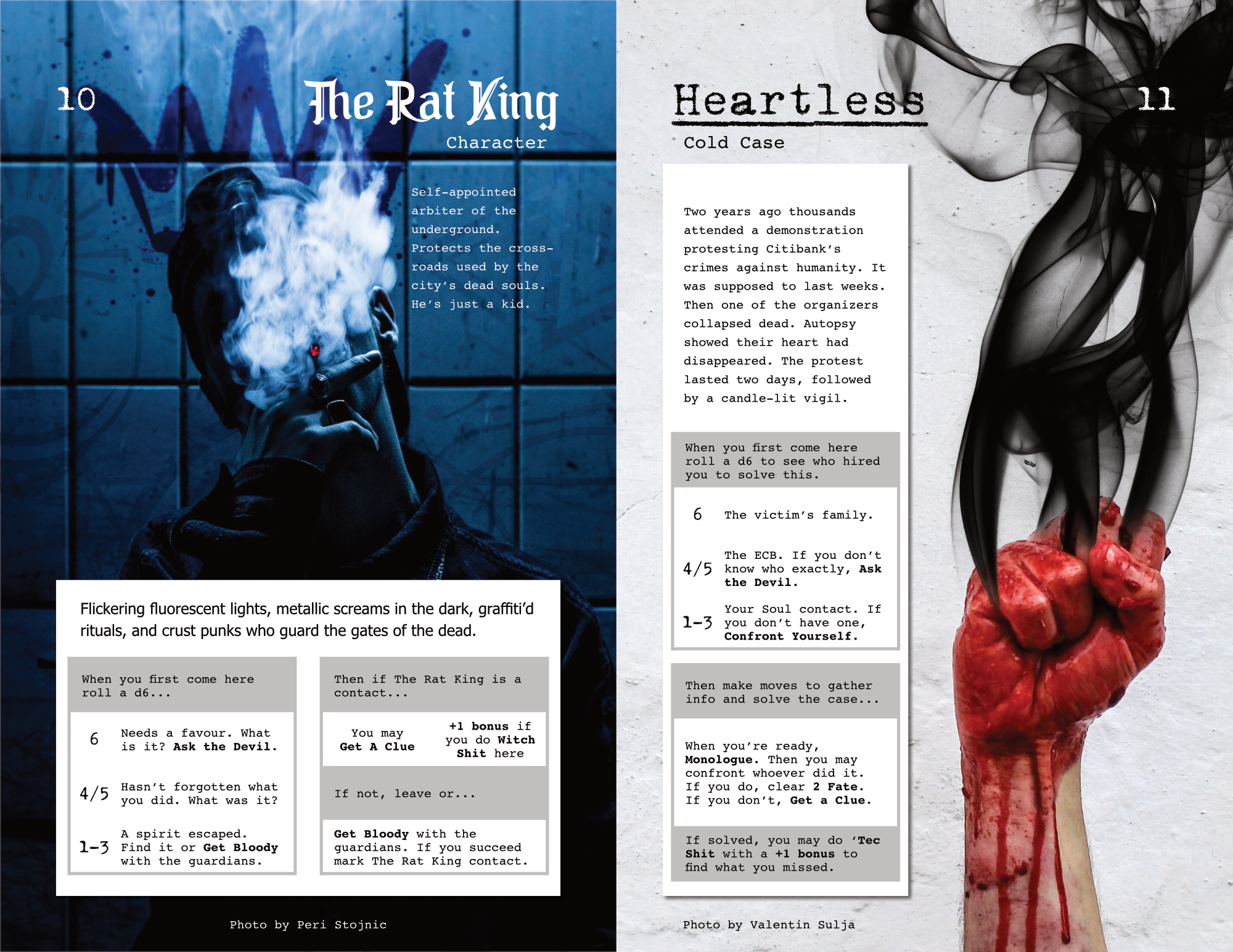 Kassandra King: Devil's Dice is a single player game about inhabiting a hard-boiled investigator as she careens around a city full of occult secrets, solving cold cases, and trying not to piss off everyone she meets. The game is fueled by the Ironsworn rules system and has moves that drive the story forward, forcing Kassandra to come face to face with her worst impulses, and either get better or worse.