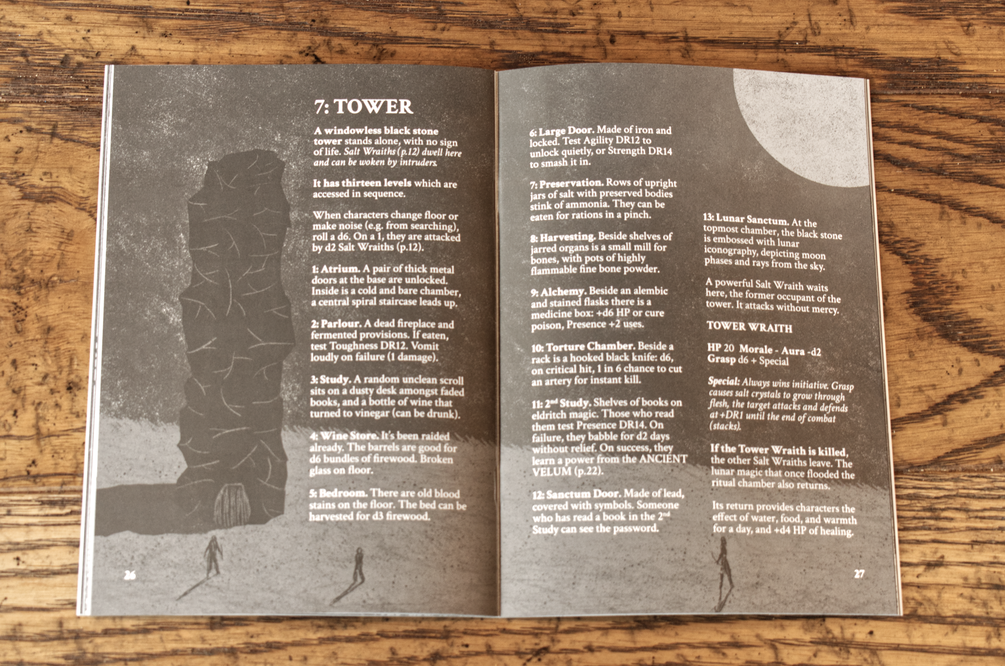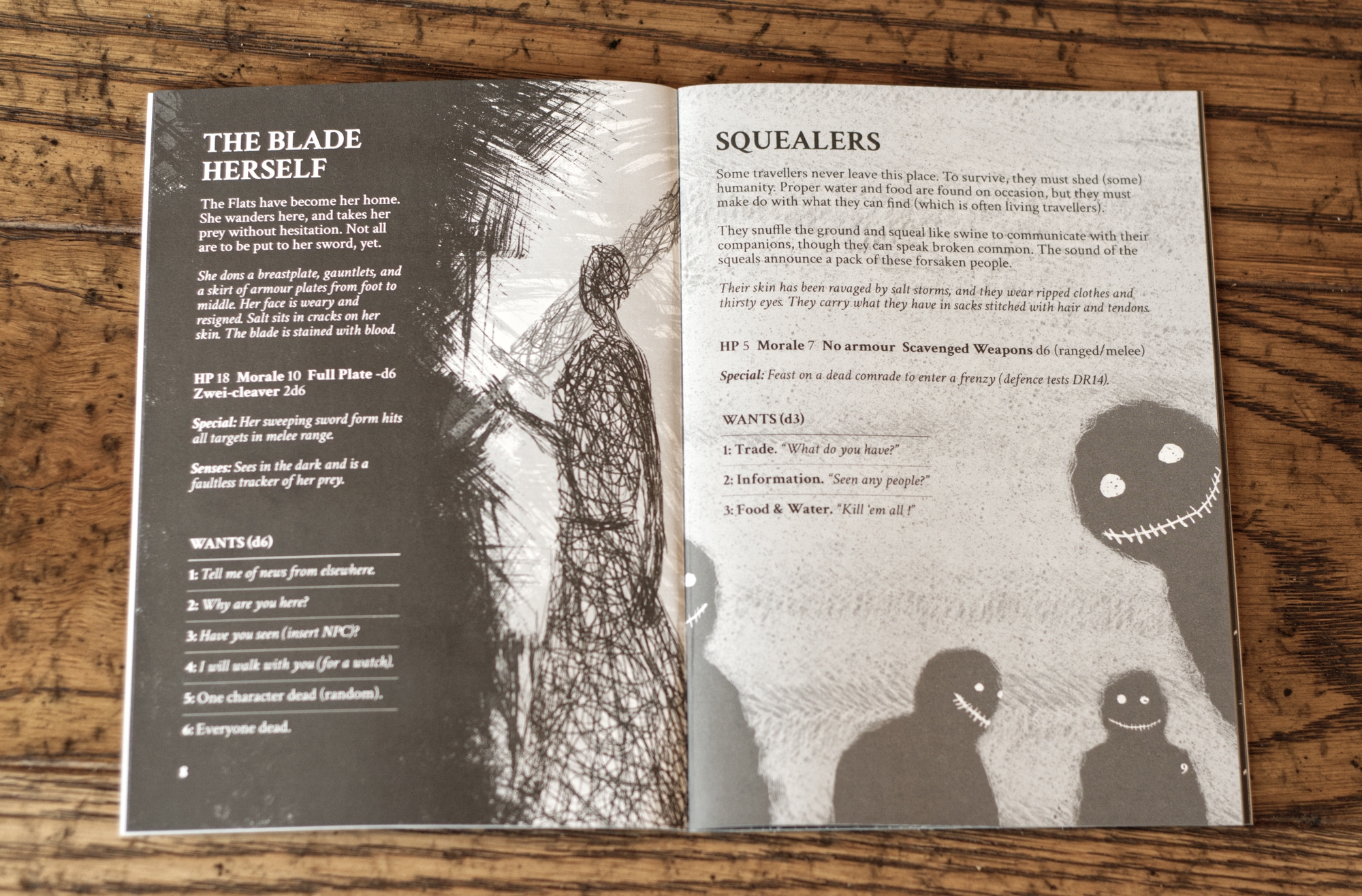 This is an adventure compatible with Mork Borg and hackable to other OSR systems by Murkdice. It’s about a journey across 'the Flats', a liminal space of salt plains that act as a grim form of magical transport for the desperate and foolish.