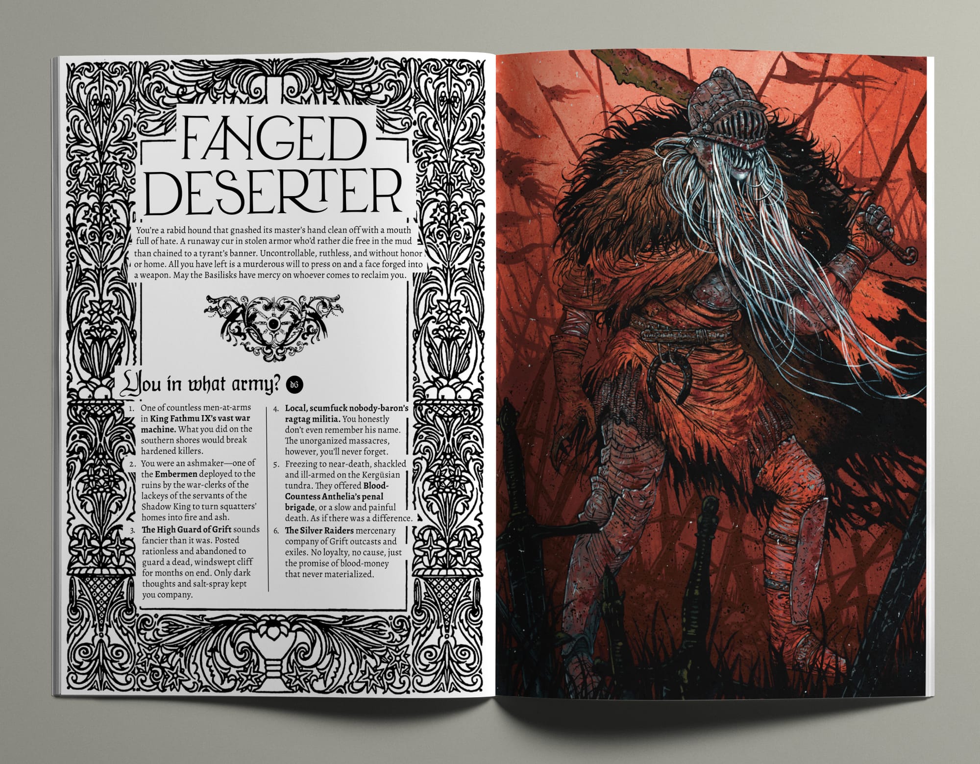 Martin’s depiction of the classes land somewhere between death metal album cover and Elden Ring character concept — esoteric, dangerous, and laden with history. But it’s what surrounds those illustrations that will surprise those familiar with MÖRK BORG’s game: Clean descriptive text. Salt, Spit, and Silver’s character prompts aren’t grappling with chaotic page layouts for attention, which made reading the original RPG feel like a battle in itself. The information is neat and clearly legible. It’s a different form of communicating ideas, an evolution of intent rather than skill or effort.