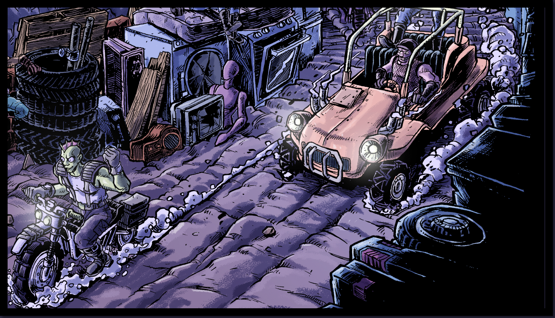 Eager contestants in jury-rigged scrap buggies flood in from the surrounding dumps to take part in motor mayhem. Winners enjoy a bump in prestige and everyone enjoys a wild afterparty. The seats are free, cause you only need the edge.