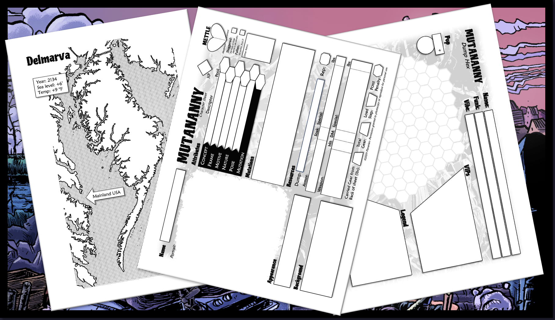 MUTANANNY is a gonzo swamp-apocalyptic role-playing game (RPG) where you and your friends play as degenerate, garbage-dwelling, fun-loving Mutants just trying to make it through their next awful day. Mutate wild and free, scavenge for precious junk, earn your place in the dump, forge bonds with other hideous weirdos, struggle to survive the moistlands, and fend off insufferable pure-strain humans.