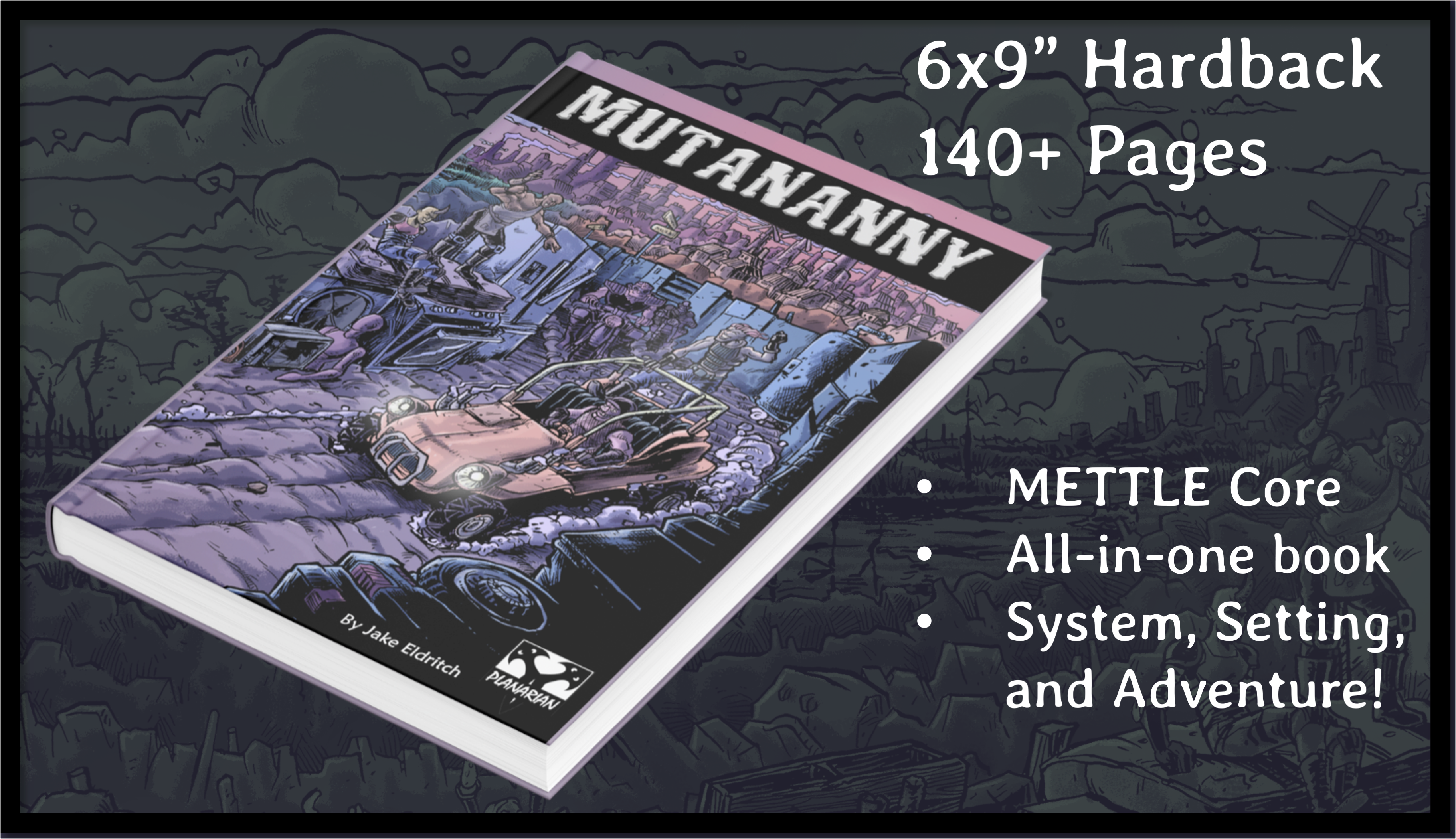 Feature-complete and currently in editing, the fully playable version of MUTANANNY is 140+ pages in 6” x 9” trade book format. This game runs on METTLE Core, a hybrid d6 dice pool system that prompts for dramatic twists on failed rolls. You can't lose, this game is all but ready to go!