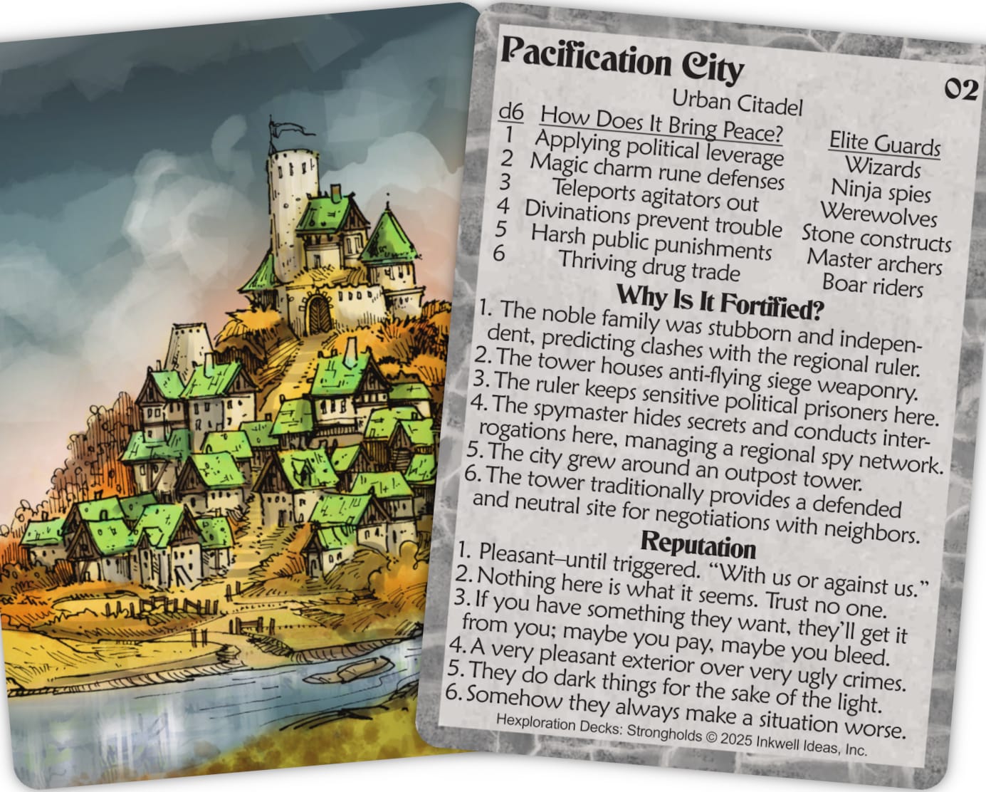 - 10 Traits cards – each packed with thematic tables you can apply to any location (add a "Hidden Evil Chapel" to as keep or make a tower "Magically Warded").
