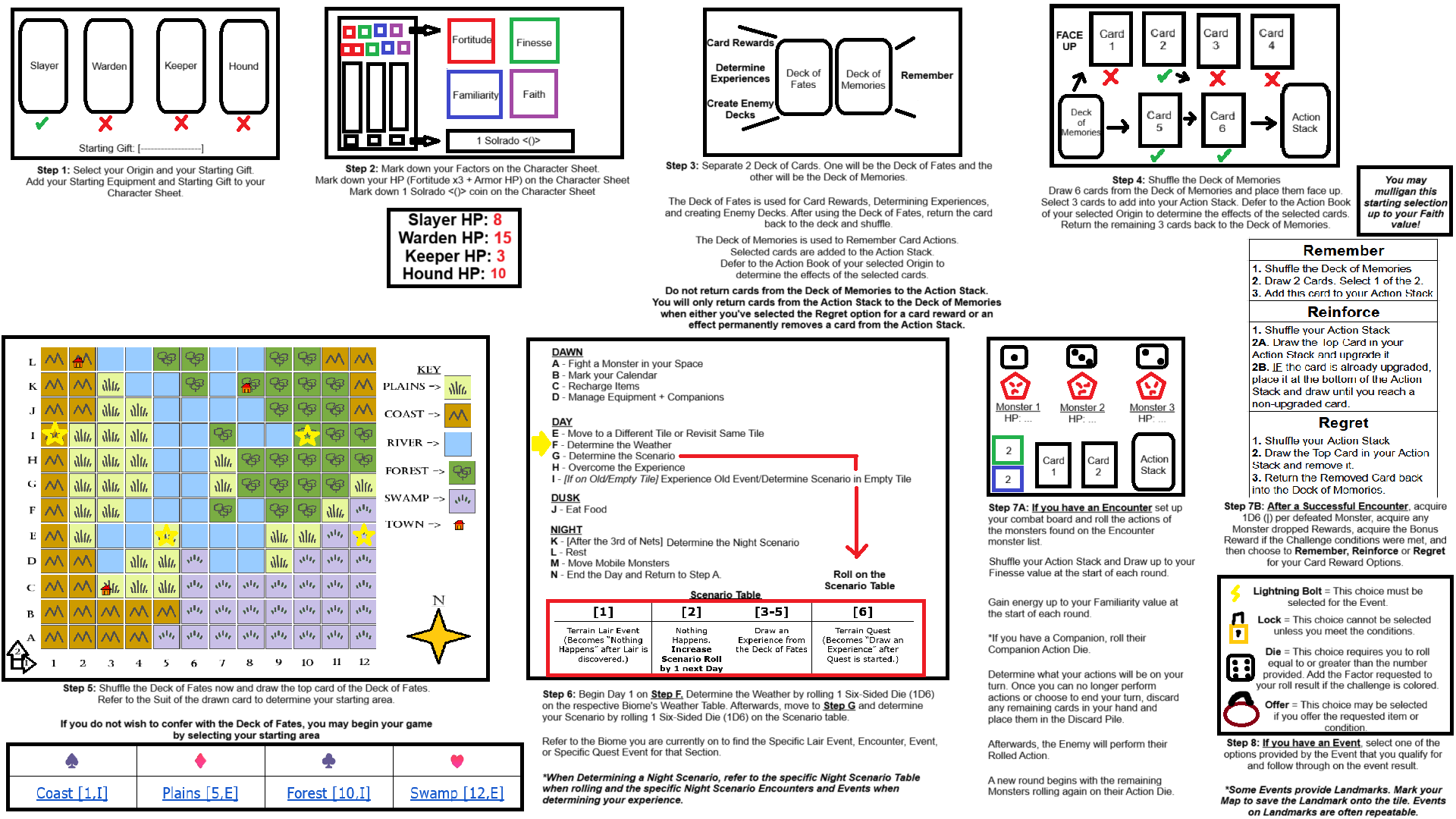 Oftentimes, running a Solo-TTRPG can be difficult so included with the game is a Form-Fillable Character sheet with built-in trackers for your Events, Encounters, and Action Stack (the Deck of Cards from which your combat actions derive from), a Reference sheet for quick references to running the tables that generate your Events and Encounters, as well as a built-in Glossary and aids for running combat, and a template for running the game online on playingcards.io if you would prefer to play using that method instead of on a physical table with cards and dice.