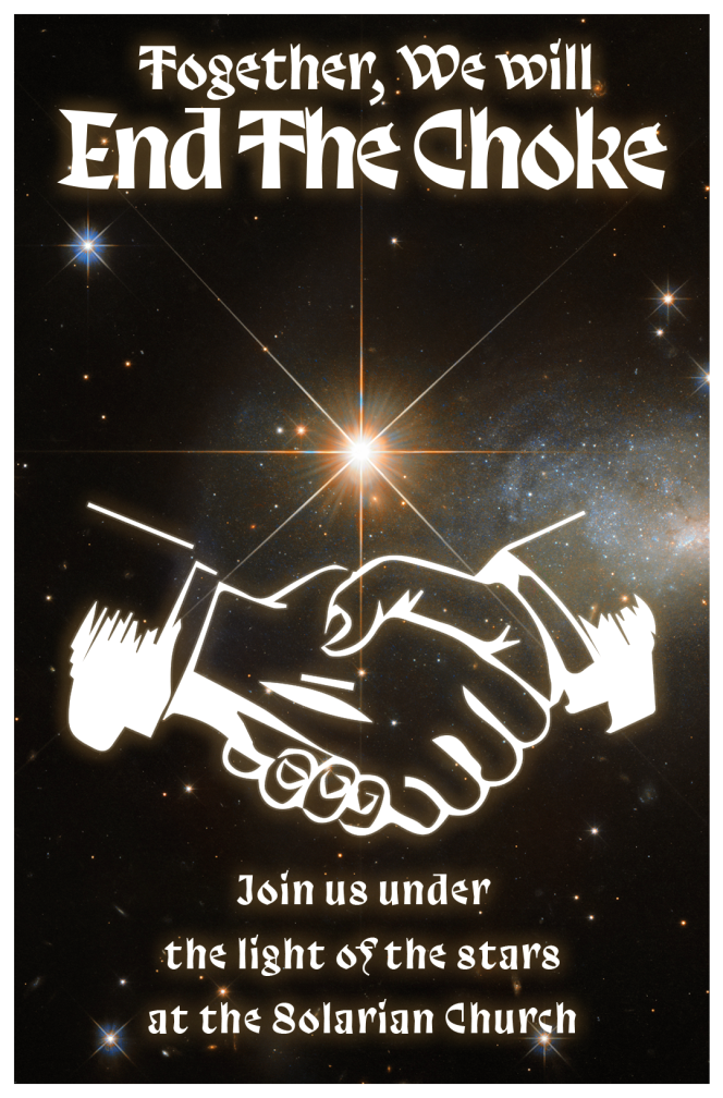 Two days before the game began, Sorensen approached me and asked if I’d like to be a Boss. I accepted, and was assigned to be a leader of the Solarian Church. I chose to be the High Gardener Otso, and was joined by Caleb Zane Huett (Triangle Agency) as Metropolitan Sampsa, and Benjamin as Pontiff Kuutar. Our goals were simple, and, all things considered, rather benevolent. Hold onto the Farm. Convert over half of the denizens to the Solarian faith. Avoid the deaths of our cardinals.