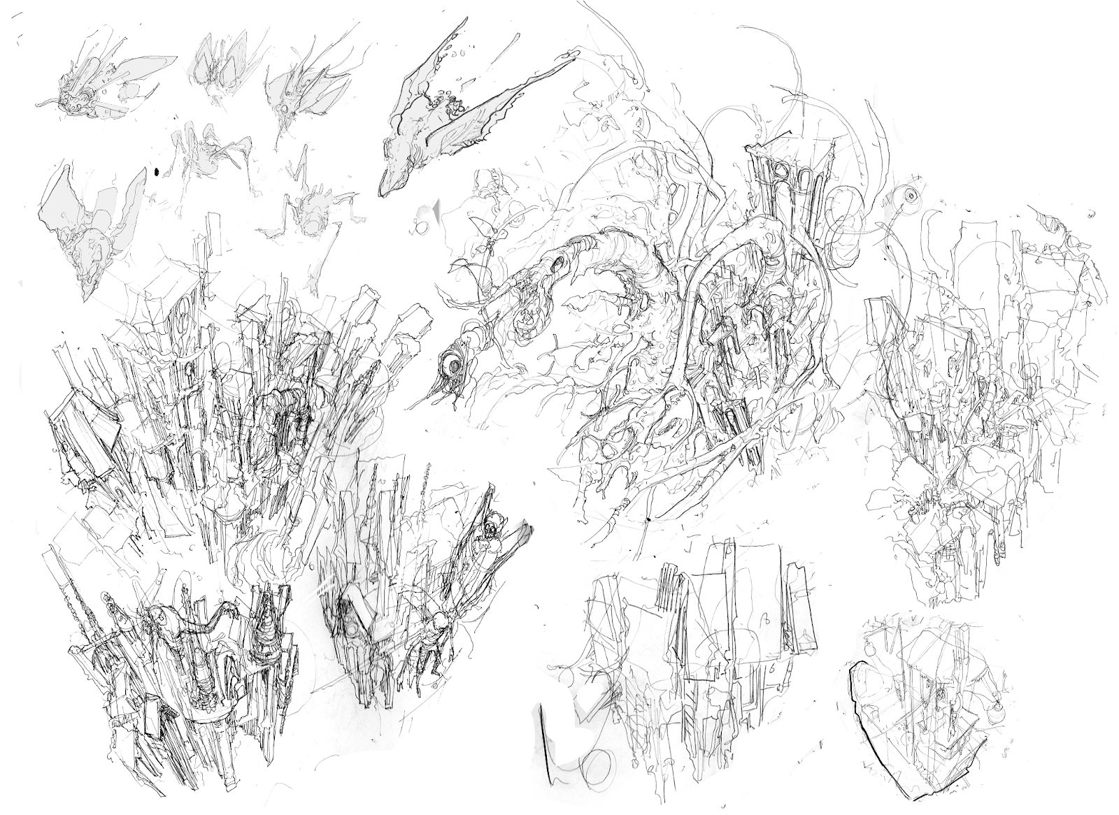 After I got home, it was time to scan in some sketches and attempt to turn them into some seriously cool-looking shapes. I stuck to three major layers of shapes, and turned on a stroke setting so I could fake like I was doing some sort of linework pass that I could print out and use a light under my glass desk to trace into an actual ink draft.