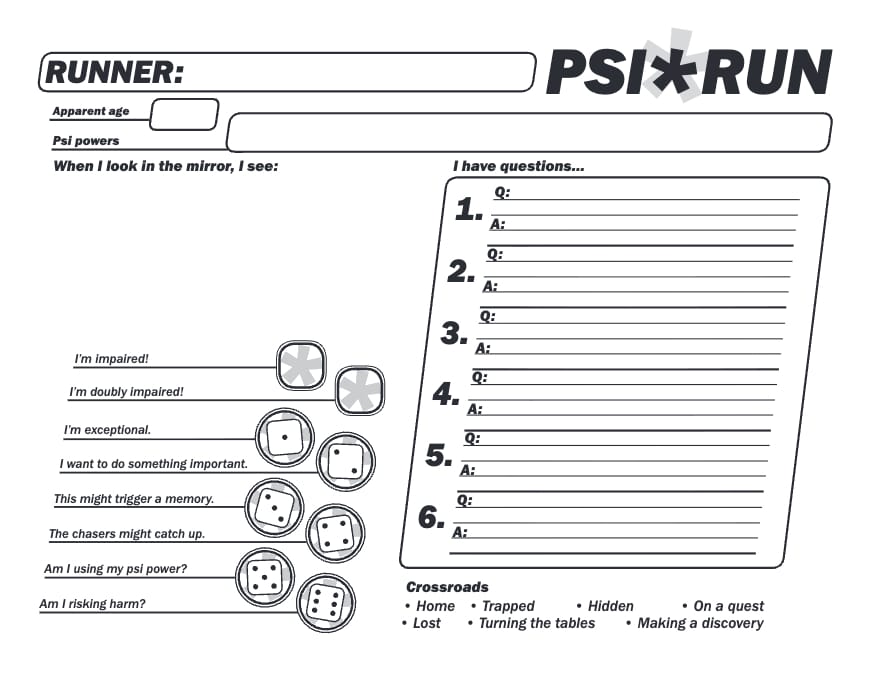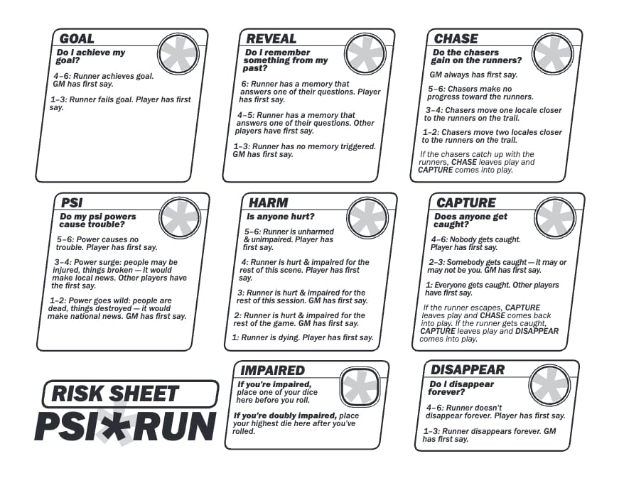 Baker: The risk sheet in PSI*RUN is an iteration on the mechanic Vincent and Emily Care Boss and I developed over 26 years ago called Otherkind. In essence, it’s a dice pool allocation mechanic, but as it’s also Powered By The Apocalypse, each die from the pool is assigned to a list of options, to shape the next bit of the fiction. I love being able to look at the dice, look at the choices, and sort of imagine the various possible outcomes before choosing the one that I’m most interested in seeing play out.