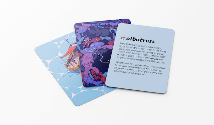 “Tacklebox is a two-player game, supposedly about going fishing with a friend or family member. But it's actually about exploring and subverting the foundations of collaborative play,” said Jonathan Walton, the designer of Tacklebox, in an email to Rascal. “The card prompts don't advance the plot. Whatever happens, you're always just fishing with your companion. Instead, Tacklebox prompts aim to gently adjust each player's internal, unspoken understanding of what's happening in the fiction of the game.” At the same time, the other player is also drawing their own cards, and the two players’ differing understanding of the game’s reality shapes their interactions with one another.