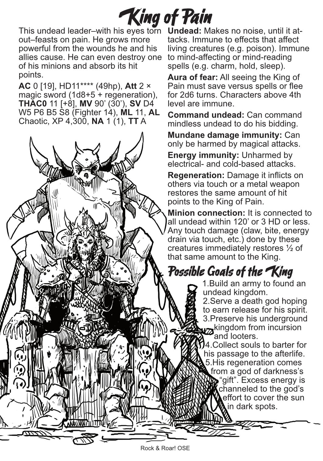 The project offers two books–one with stats for Shadowdark, and the other has the same monster concepts and art but with stats for Old-School Essentials (OSE, a faithful B/X or early D&D clone). The focus is to make good monster concepts based on a song title or band name with just a couple of small homages. Only a few monsters lean in heavily to a song's lyrics or facts about a band.