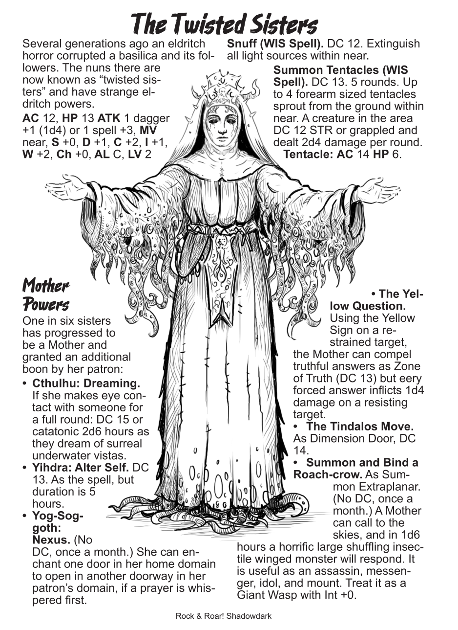 Back the Zinequest Kickstarter for a book of monsters such as Twisted Sisters and Eyes Without a Face. Pick either the Shadowdark or the Old School Essentials version. Stretch goals are adding bonus monsters, magic items, and more at no extra cost!