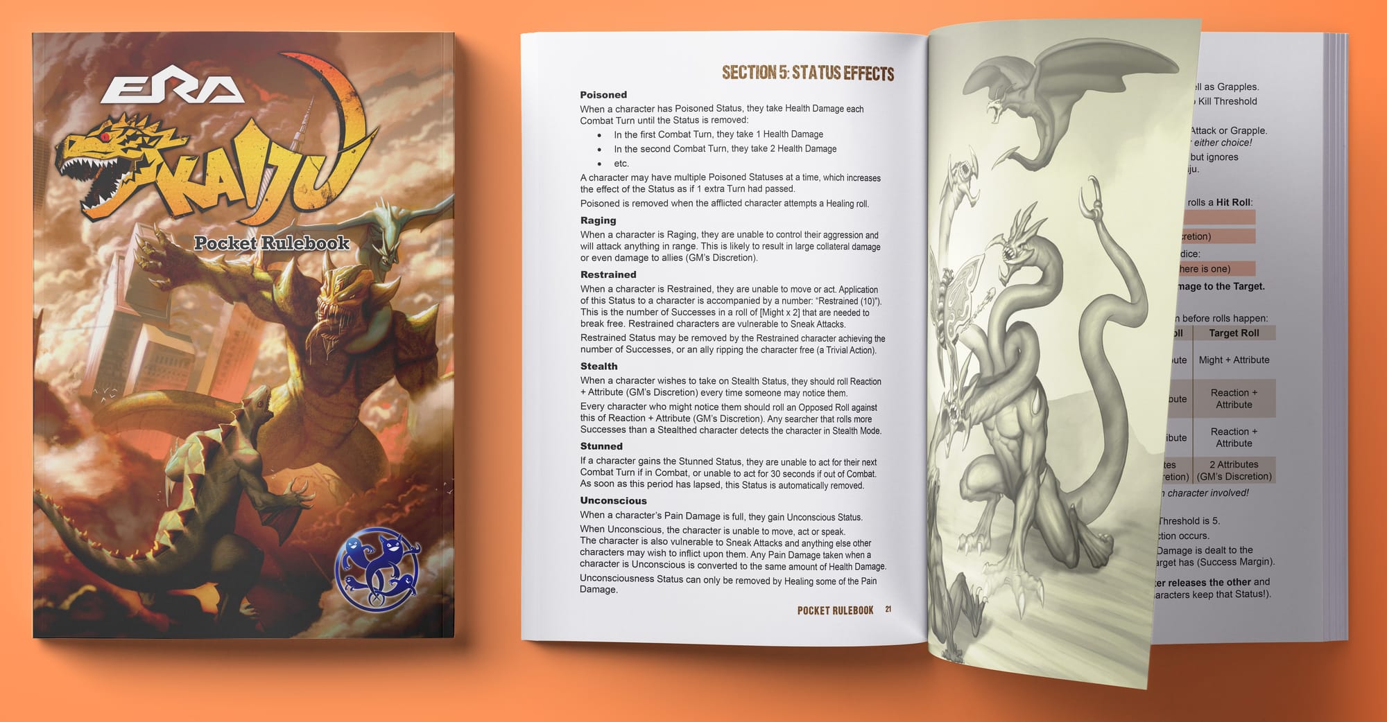 The Kickstarter campaign, which launched on 23rd February and ends 17th March, will print Era: Kaiju, the latest game from award-nominated designer Ed Jowett. The Pocket Rulebook contains everything you need to play: a brief introduction to the world, complete character creation (including a selection of forms!), 25 Kaiju powers, the complete Era d10 Rule Set or gameplay and GM advice for running the game!
