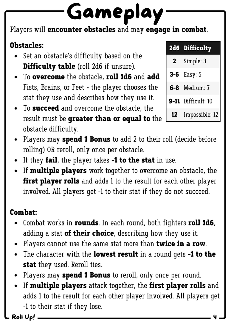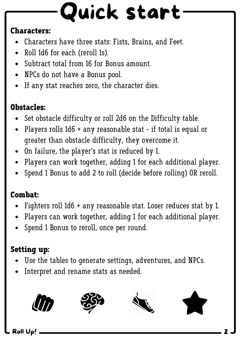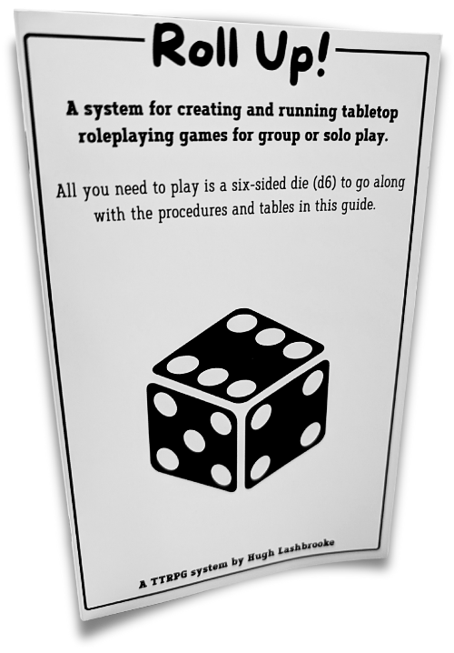 Roll Up! is a tabletop roleplaying game system designed to allow people to dive into a world of adventure with minimal fuss. Rolling up a new character, setting up a world, and starting an adventure takes just a few d6 rolls and can be done in less than a minute.