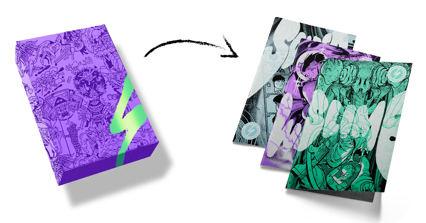 - Three Zines (~35 pages each), printed in eye-popping spot color with new monsters, gear, random tables, runs, and character options.
