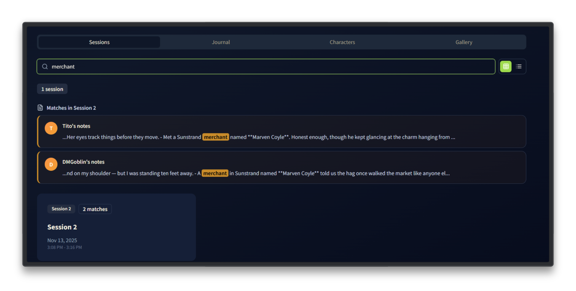 - Session Notes including image upload, secrets, goals, and chats are collected automatically at session end. Players can choose to keep their notes private or share with the party.