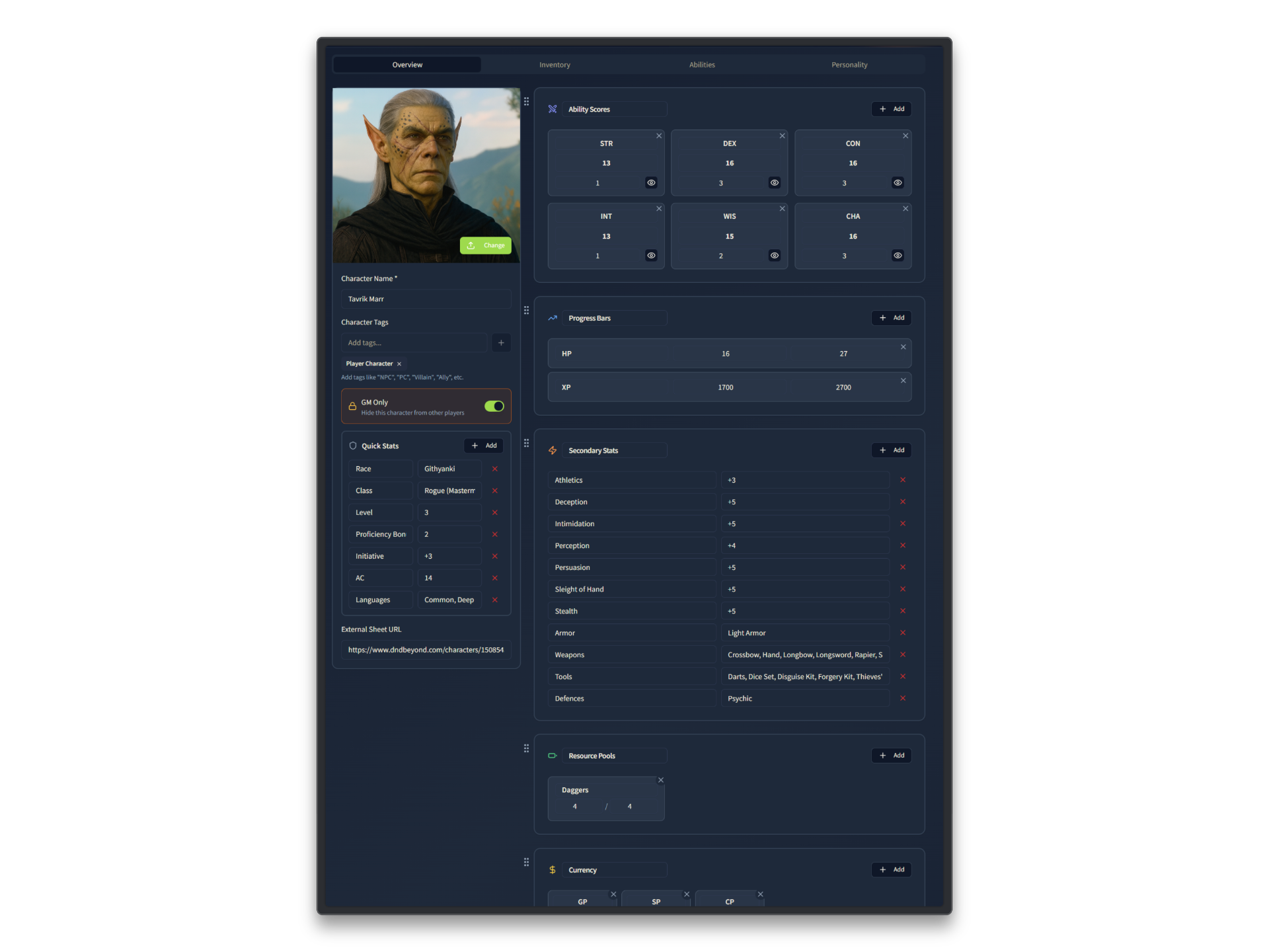 Story Goblin includes a fully modular, system-agnostic character builder that adapts to almost any tabletop system, even solo campaigns. It isn’t just “we left you a few blank boxes so that counts”.