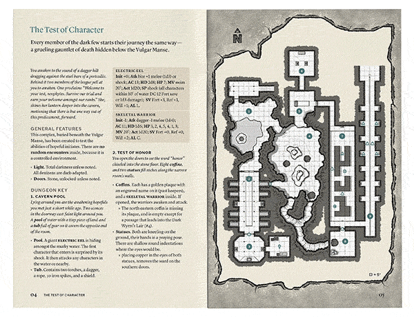The League of Dark Few saga begins with two digest-sized, full-color illustrated zines. The first entry, “The Dungeon Dweller’s Handbook,” outlines all the details necessary for a GM to run the faction and generate compelling missions for characters to complete. The second entry, “The Secrets of the Vulgar Manse,” details a level-0 gauntlet where the players navigate a horde of new recruits through a brutal initiation ceremony designed to test the characters’ mettle.