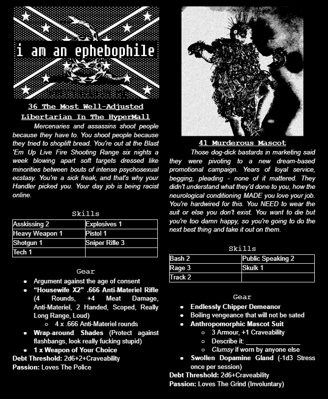 HyperMall: Unlimited Violence is in Early Access not because it isn't finished, but because we (royal we) want it to be as unhinged and vile as possible. Updated layout, more art, more gore, and more raucous action. We smashed through our first funding goal in 3 days, unlocking DLC 1: HyperMall: FreakShit Catalogue, an upcoming supplement featuring d66 NEW Contractor Backgrounds. DLC 2, HyperMall: Posthuman Blues, will focus on expanded HyperMall: Unlimited Violence's existing mech combat rules and will add d66 new mechs to the game.