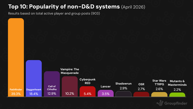 But when we remove D&D from the data, we are left with a very different and varied picture. While none of these are currently overthrowing the big name, they are still alive and kicking. Systems like Pathfinder, Call of Cthulhu, Cyberpunk RED, Mutants & Masterminds (and others) aren't just surviving - they are on the map.