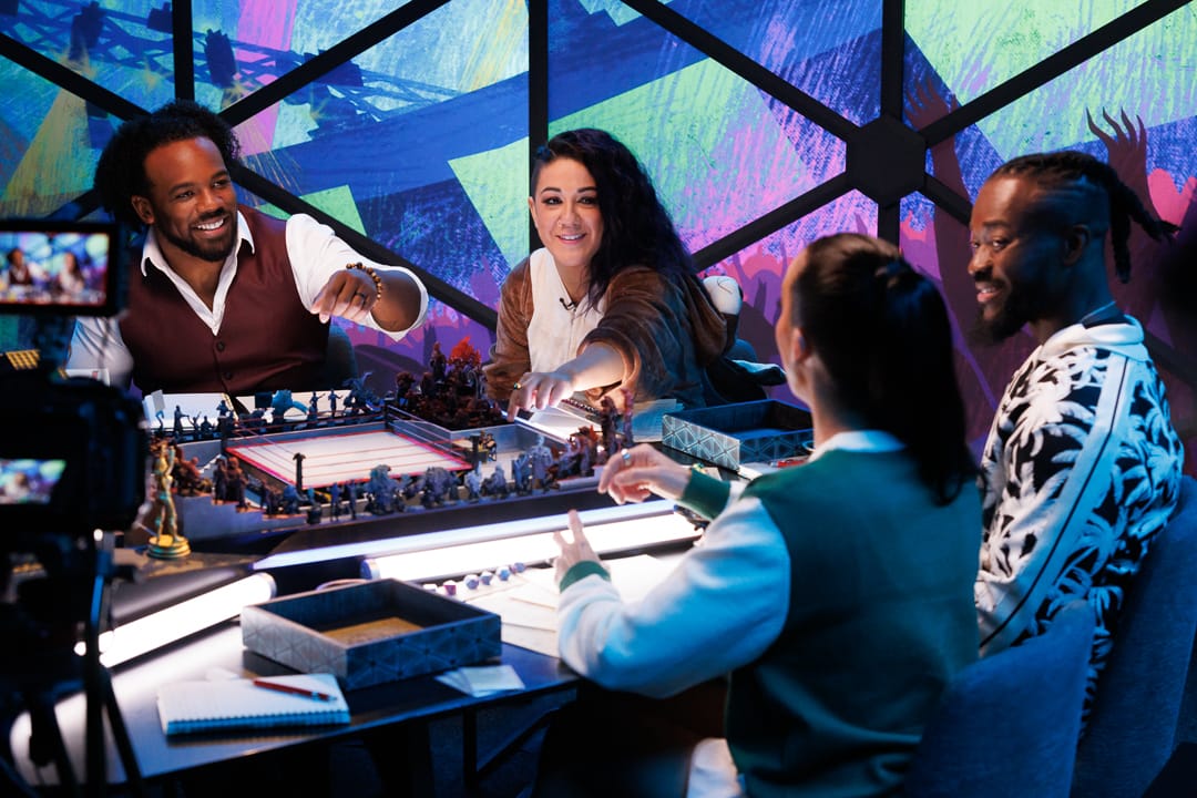 The latest Dimension 20 season leans into these similarities. “D&D, professional wrestling, and Greek mythology all have this [shared presentation],” said Mulligan. “You can call it tall tale. You can call it epic myth. You can also call it camp. The sequined-covered spotlights, lasers, the gods, Olympus, the big kind of storytelling.” Titan Takedown follows four WWE Superstars; Xavier Woods, Bayley, Kofi Kingston, and Chelsea Green, playing as underdog monsters from Greek mythology. Each one is cursed, and all four enter into a wrestling tournament to claim a seat on the pantheon. The tournament is run by Zeus, called “Big Z” throughout the series, who Mulligan portrays as a mixture of Vince McMahon and Macho Man Randy Savage. The season is flashy, utilizing the developed technology, prop work, and miniature battle sets to bring the spectacle of professional wrestling into the iconic D20 dome.