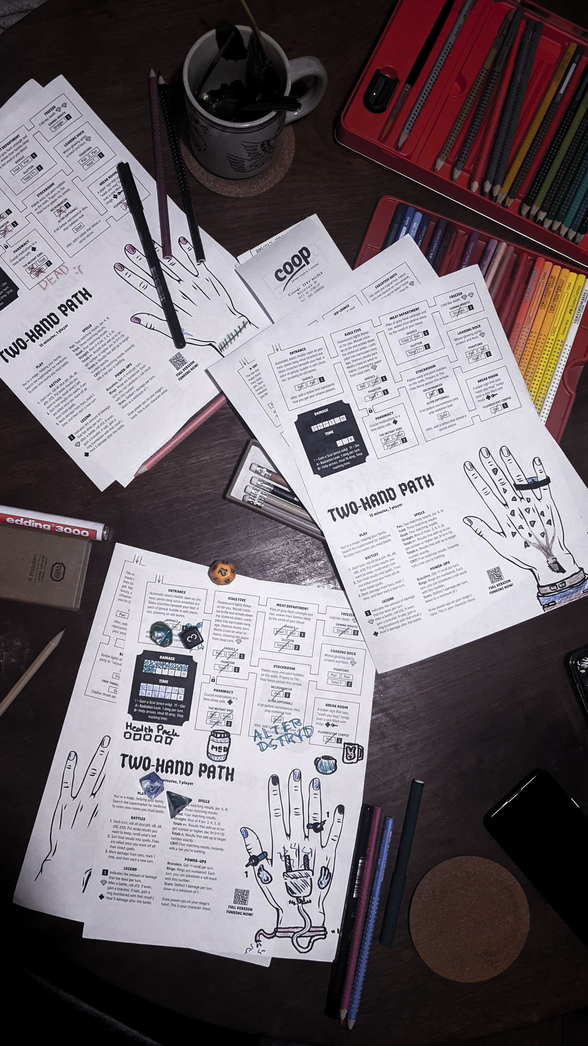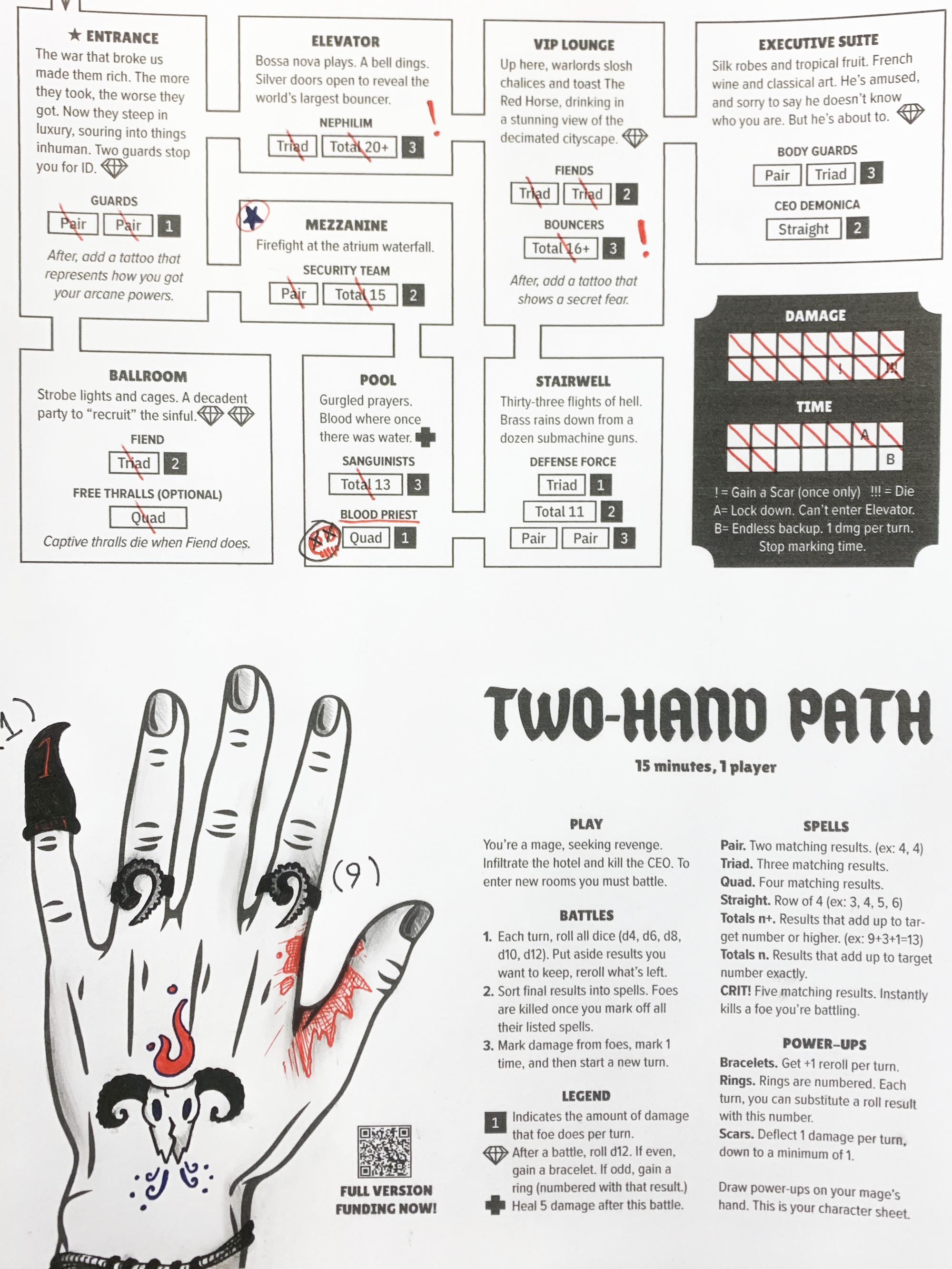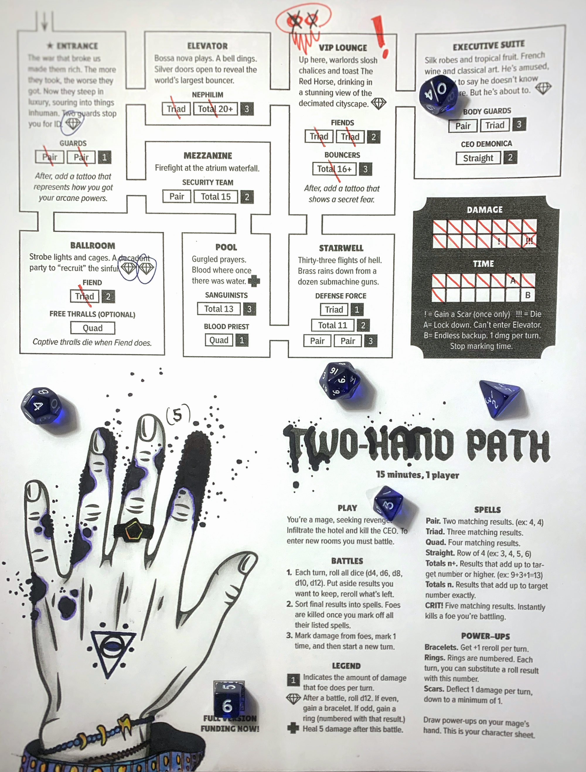 Level-up by drawing rings, bracelets, tattoos, and scars right on your character's hands. This is your entire character sheet, and everyone's sheet ends up unique.