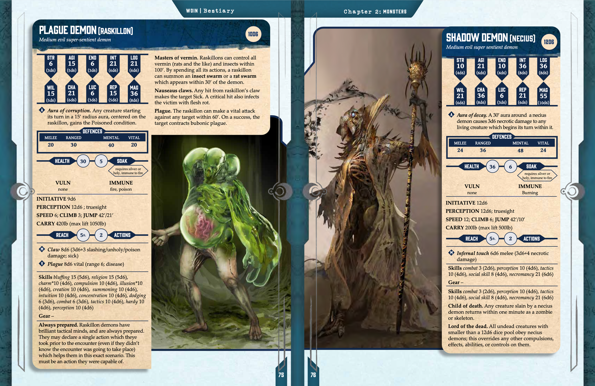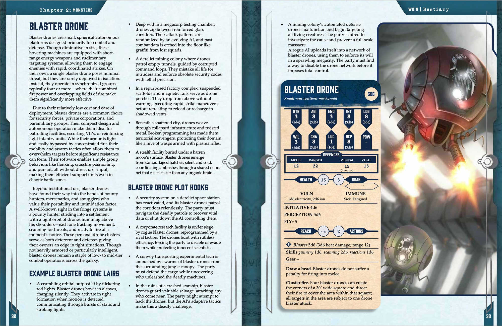 The NPCs, beasts, monsters and villians in this book are compatible with medieval fantasy, contemporary action, and future sci-fi, but may not be thematically suitable for all settings and campaigns. This is why Chapter 4 of the W.O.I.N Bestiary teaches game masters how to customise the monsters found in the book to suit their own settings. Chapter 5 of the book goes one step further and walks readers through designing their own monsters from scratch.