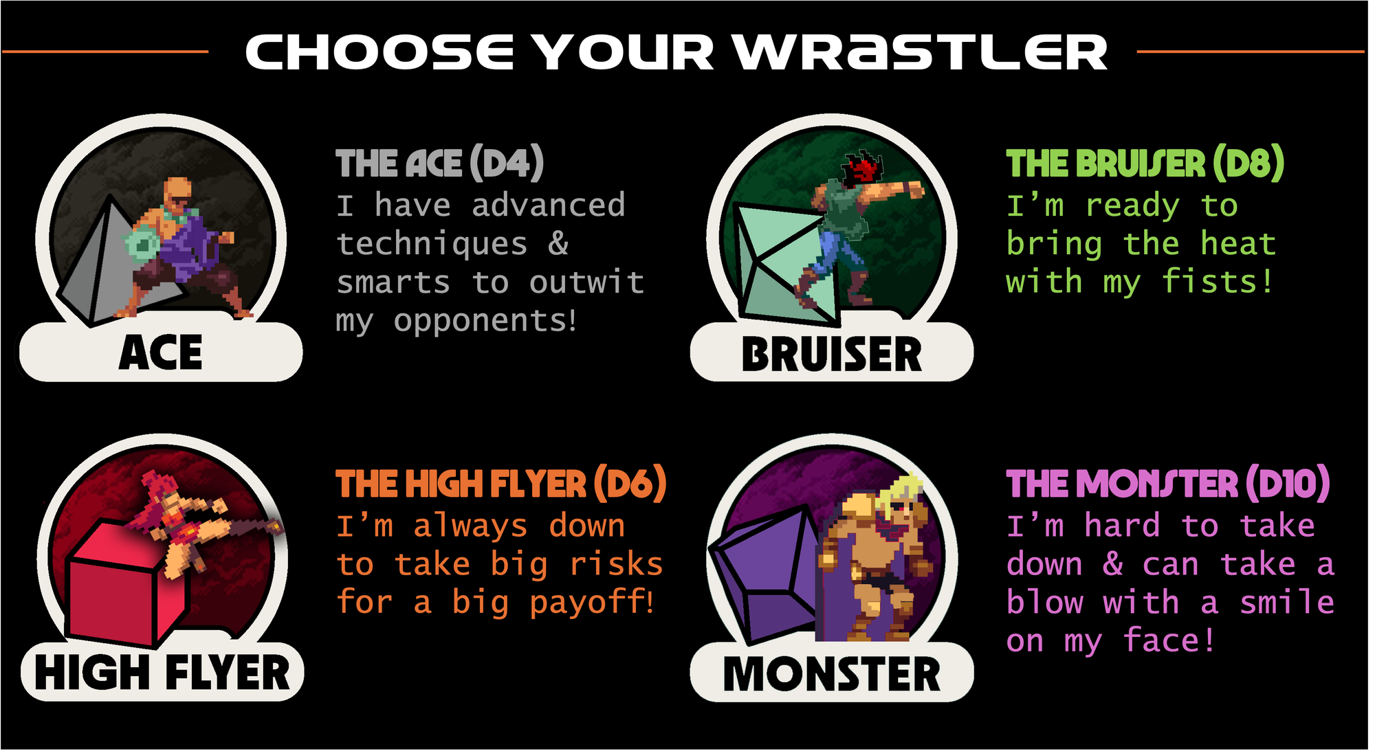 In WRASTLEVANIA, the type of wrestler you choose also determines which die size you roll during the game. The Ace only ever rolls a d4 while The Monster only ever rolls a d10. Your ROLE is your ROLL!