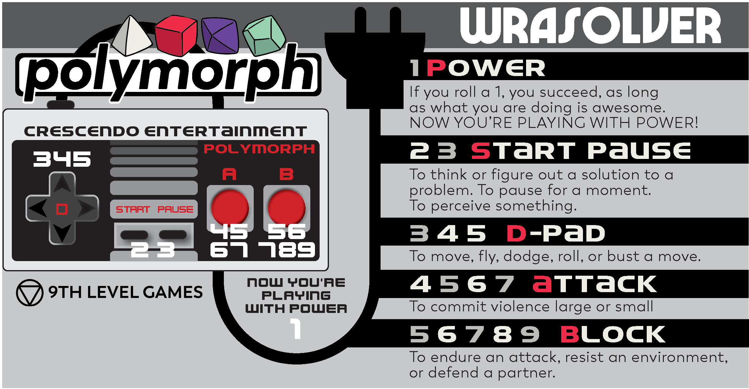 WRASTLEVANIA uses our polymorph™ rules system. In a polymorph™ game, each player only ever uses their specific polyhedral die (d4, d6, d8, or d10). Each die represents a different “way to play” or a different “role” that they have in the group. Whenever a player asks “can I do something?” they roll their die and with a quick glance at a resolution chart, know if they succeed.