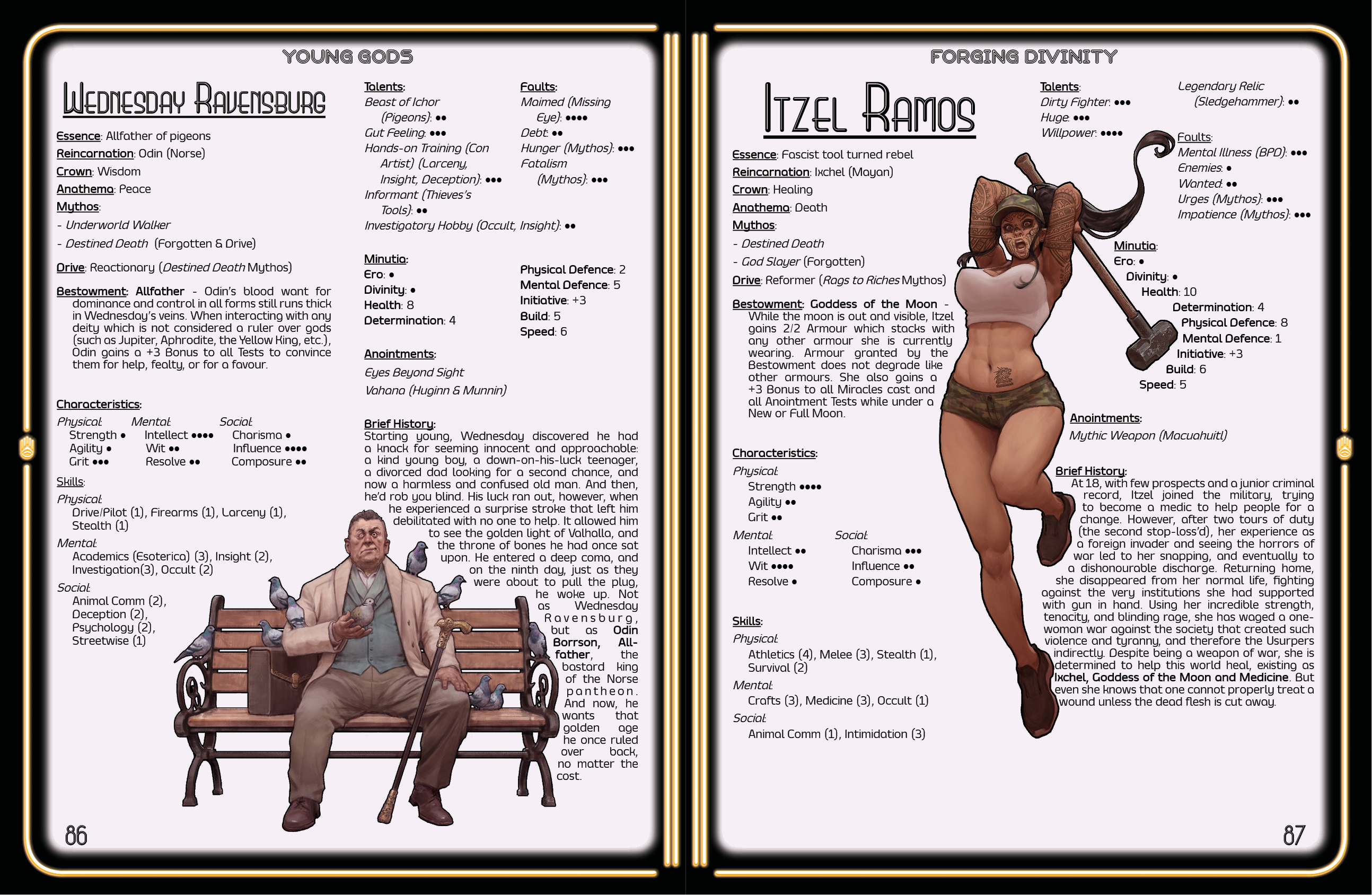 Young Gods features novel systems for becoming and playing as a god, in whatever ways that means to us mortals. It contains:
